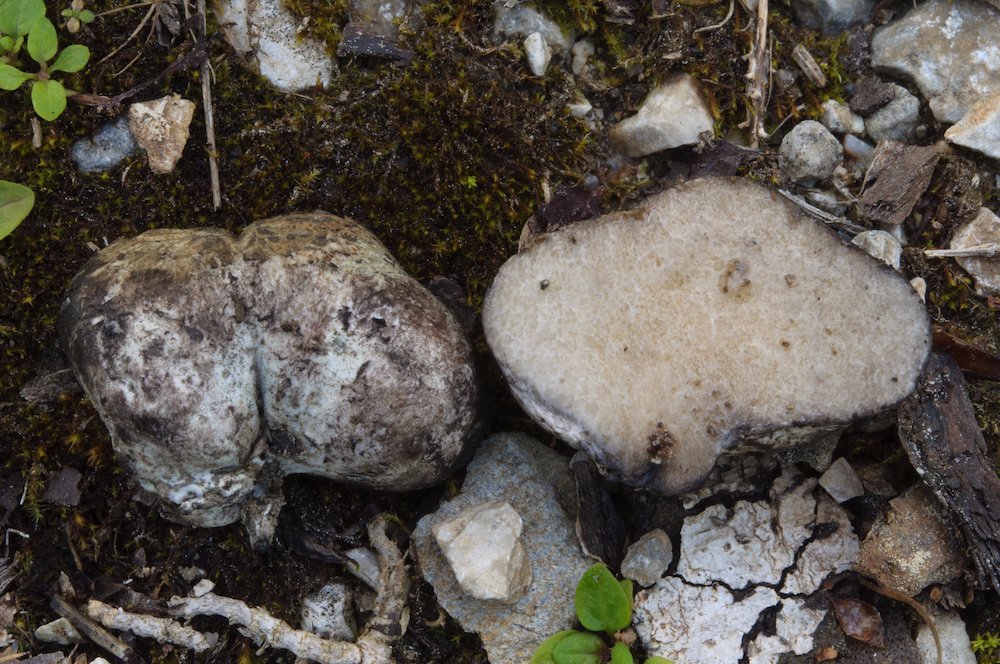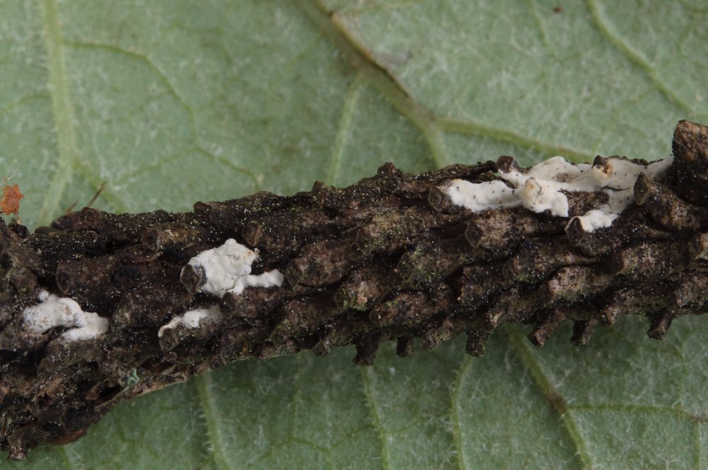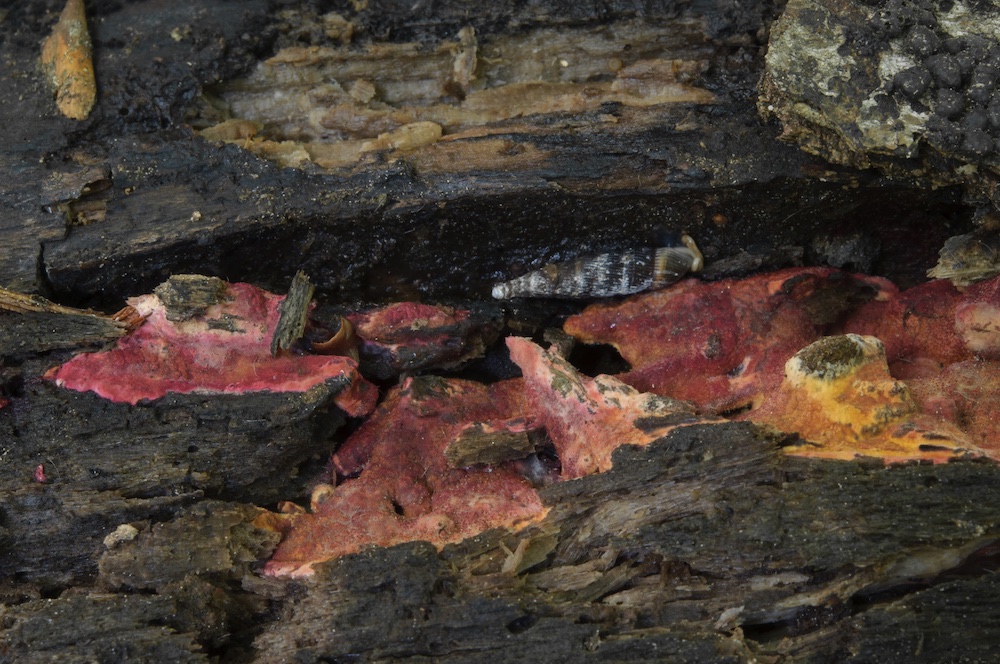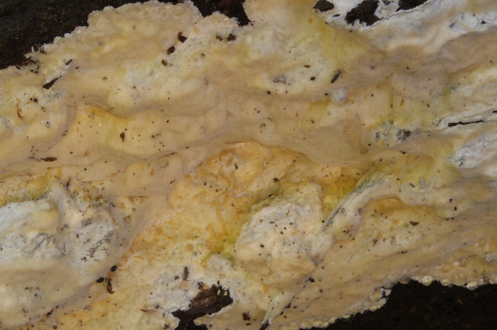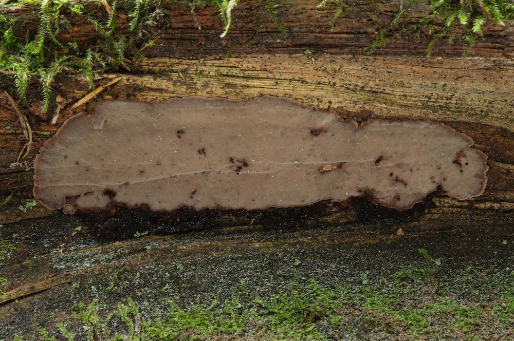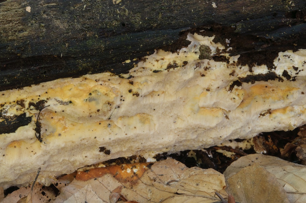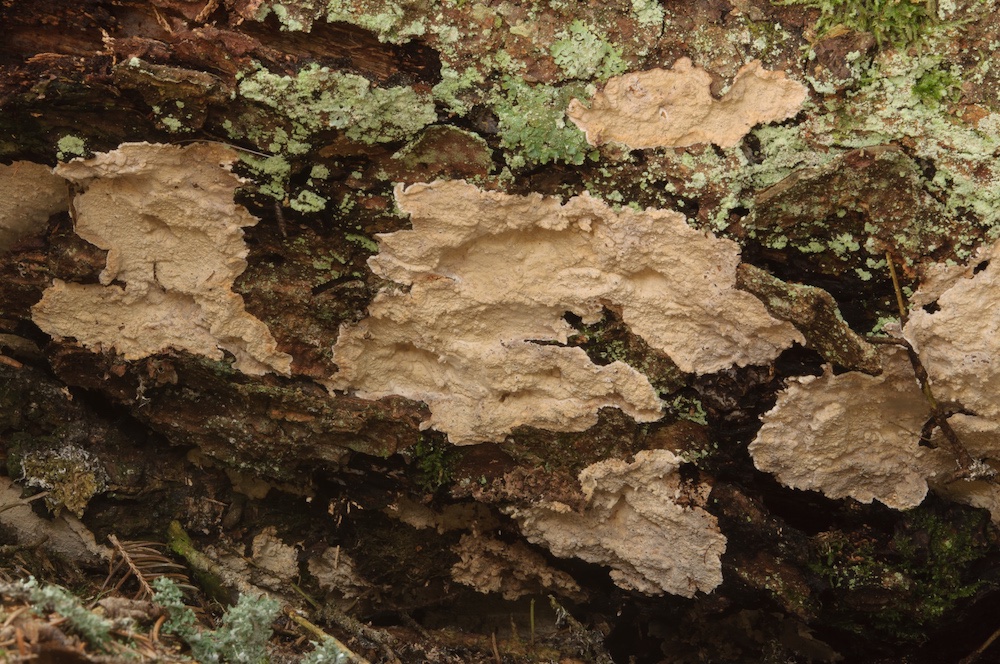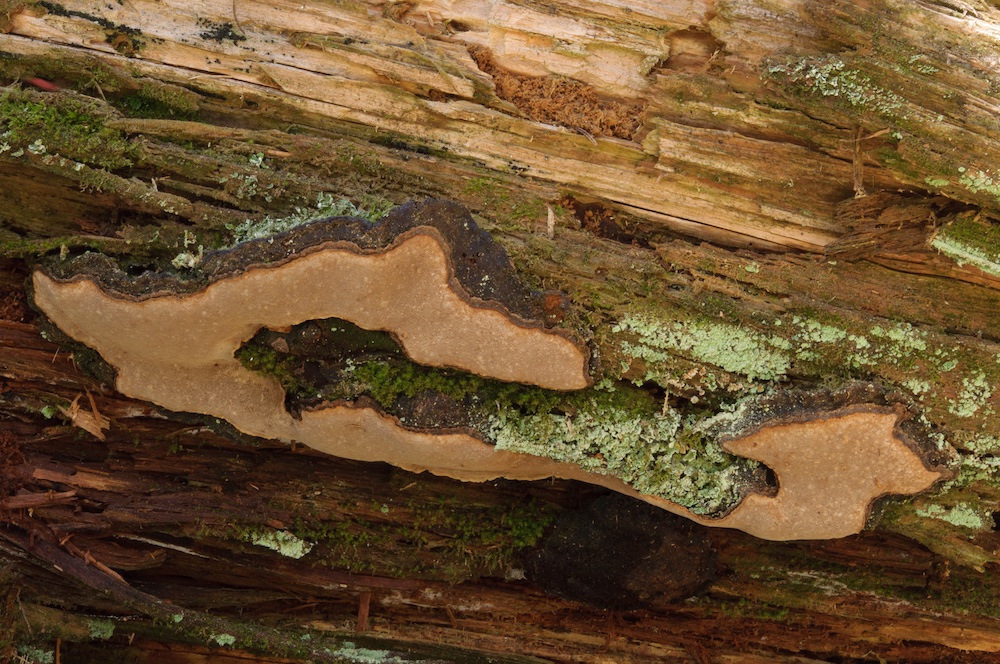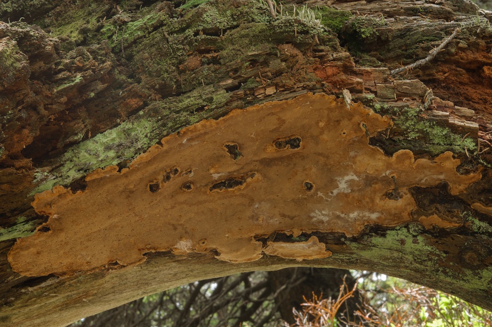 Fuscoporia viticola (wächst gerne resupinat an der Unterseite von abgestorbenen, noch befestigten Picea-Ästen)