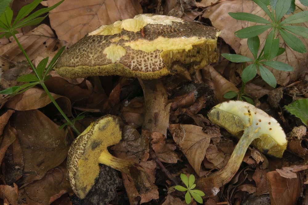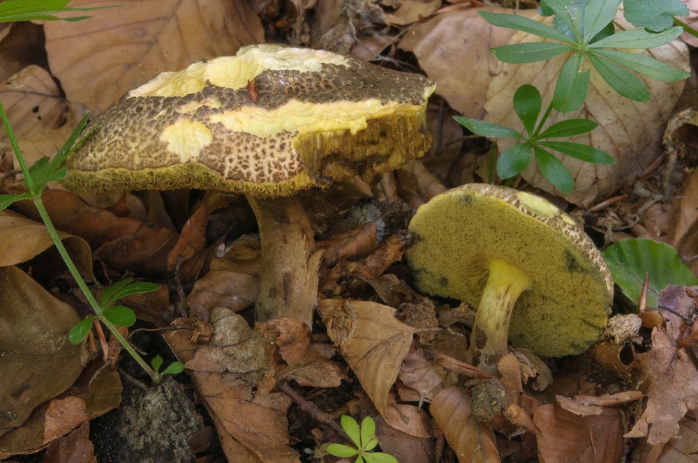 Xerocomellus porosporus/truncatus: Ein Filzröhrling mit abgestutzten Sporen unter älteren Buchen. Mit Wolfgangs Schlüssel komme ich zu diesen beiden Arten – ob die Sporen längsgerippt sind, kann ich im LM nicht sicher erkennen, ich werde aber versuchen, das im REM überprüfen zu lassen. Für X. porosporus irritiert mich das blauende Fleisch etwas, X. truncatus kenne ich nicht. .