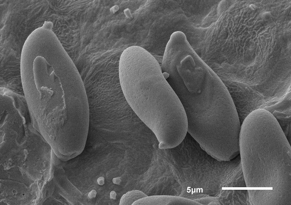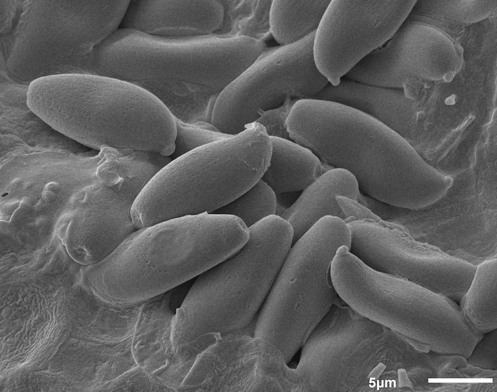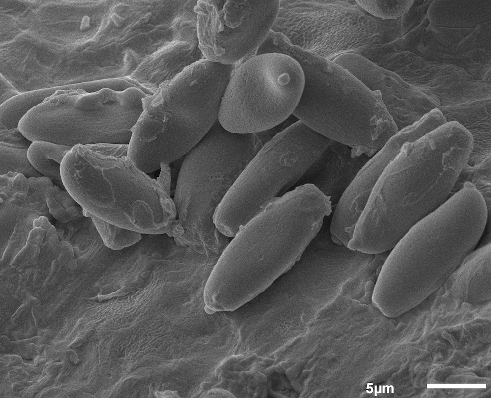 ein kurzer Nachtrag zum Filzröhrling noch. Die Sporen sehen im REM ziemlich glatt aus, es ist höchstens eine extrem feine Längsstreifung zu erahnen – damit sollte es Xerocomellus porosporus sein.