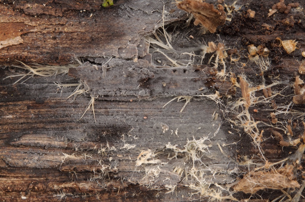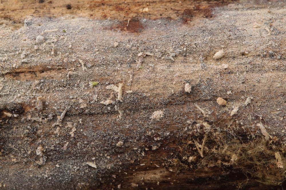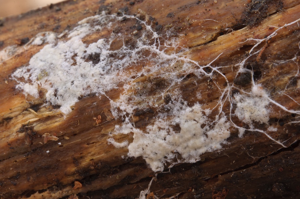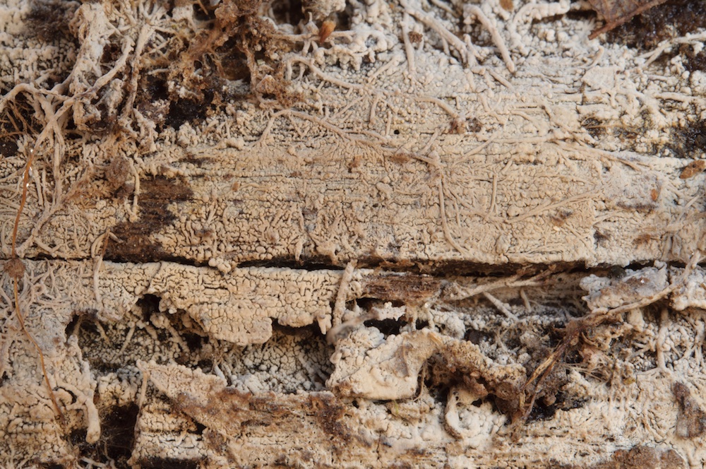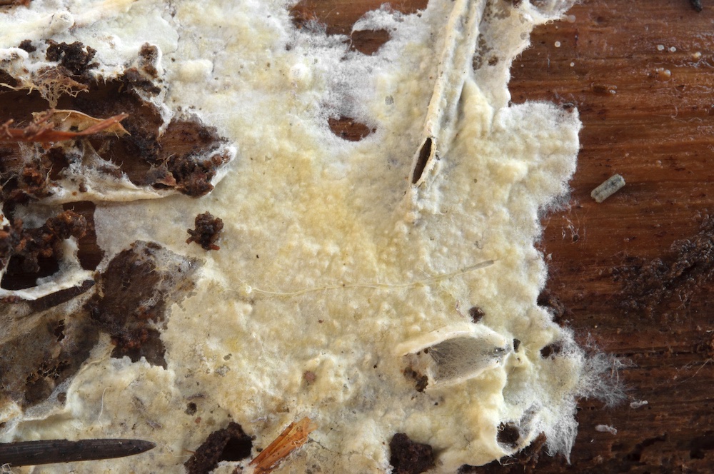 Coniophora puteana: Eine häufige Art, die man auf Laub- und Nadelholz antreffen kann. Hier auf einem entwurzelten Fagus-Stamm.