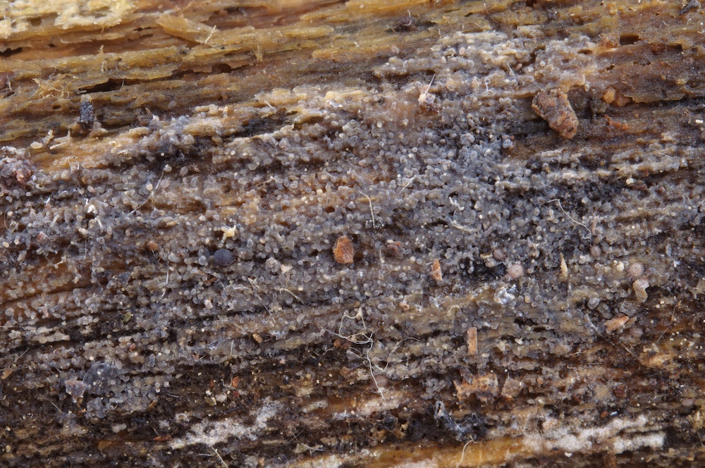 Vesiculomyces citrinus: Besiedelter hier großflächig einen liegenden Pinus-sylvestris-Stamm.