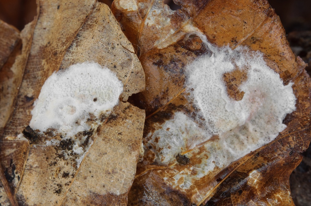 Byssomerulius hirtellus: Noch ohne Nachweise in der Mykologischen Datenbank. Gefunden auf einem liegenden Fagus-Ast bzw. von dort auf Buchenblätter übergehend.