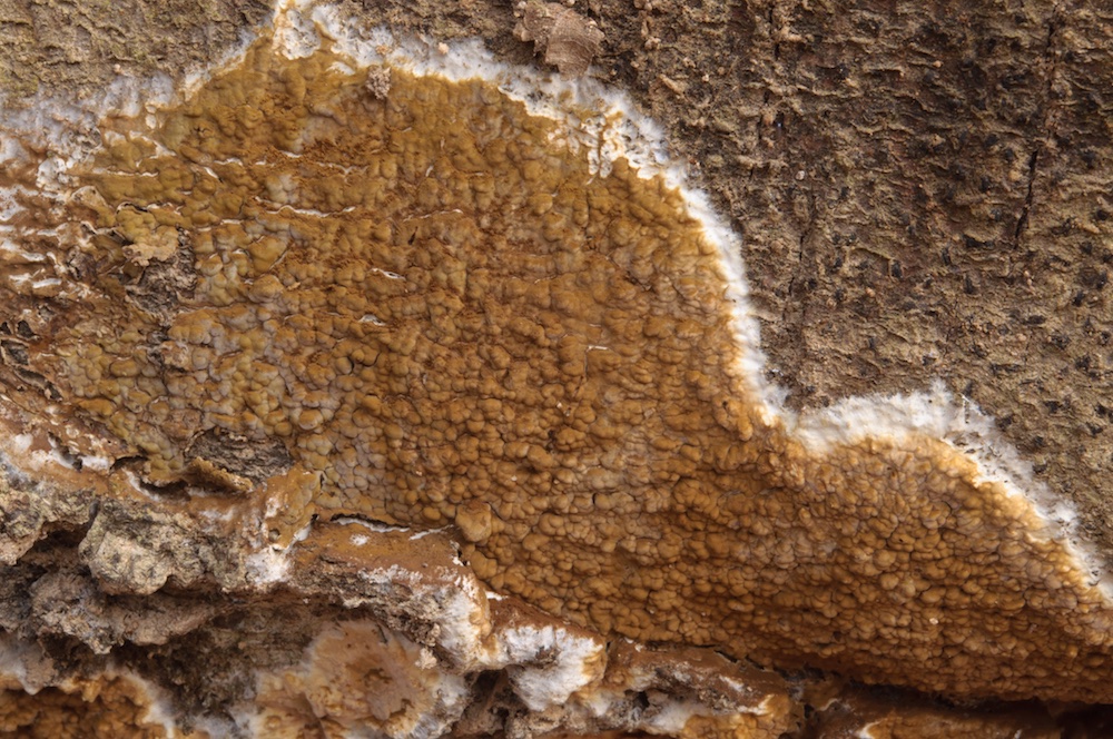 Gloeohypochnicium analogum: Trotz der auffälligen Fruchtkörper gibt es in Österreich erst sehr wenige Nachweise, was für die Seltenheit dieser Art spricht. Eigentlich kann man sie schon makroskopisch ansprechen, sie verströmt nämlich einen wunderbaren süßlich-obstartigen Geruch, auch noch im trockenen Zustand! Liegender Fagus-Stamm.