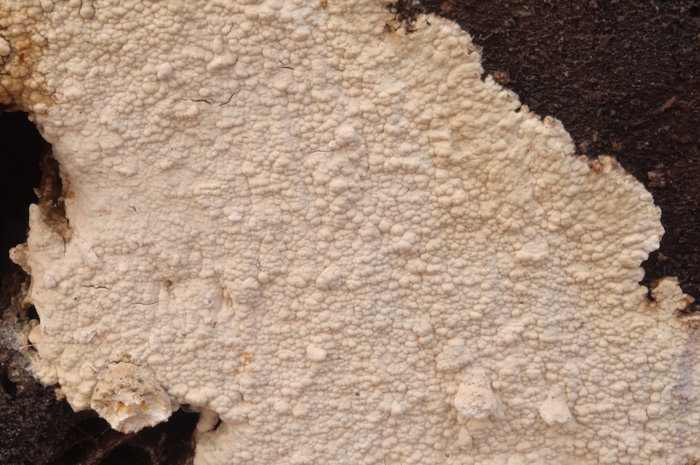 Phlebia livida: Siehe oben. Die weißlichen Punkte auf der Oberfläche sind eingeschlossene Kristallanhäufungen. Liegender Fagus-Stamm.