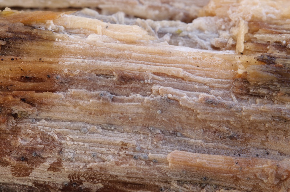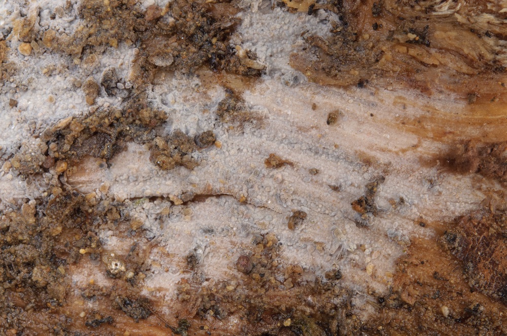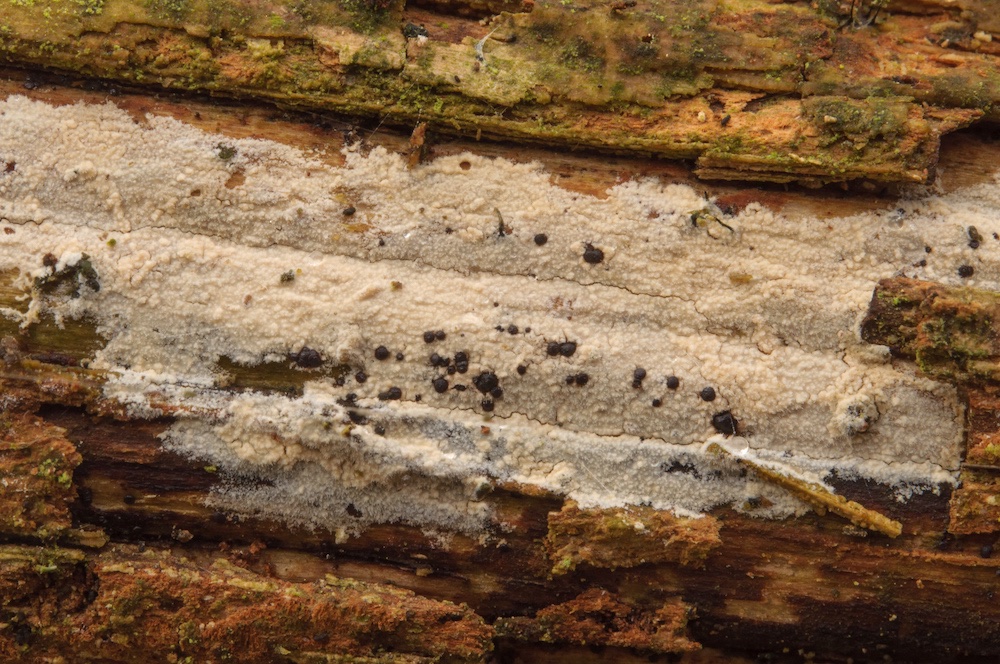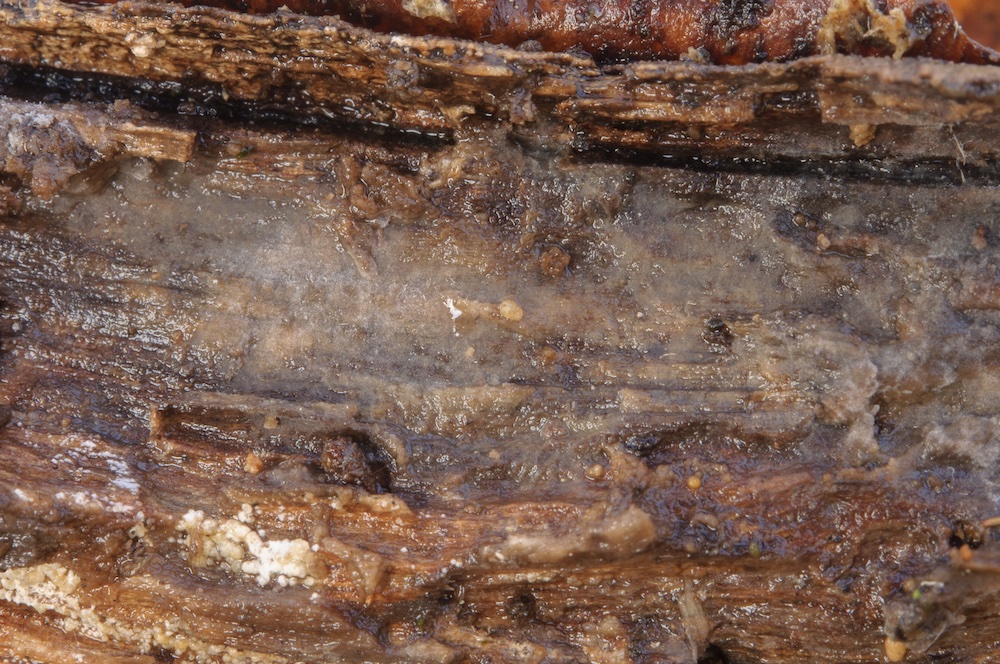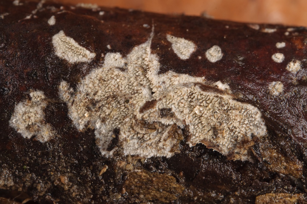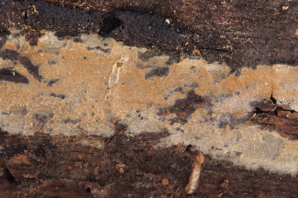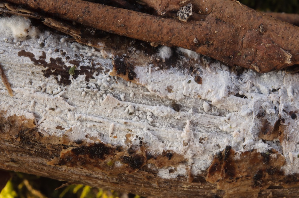 Cylindrobasidium laeve: Sehr häufiger Pilz, in diesem Fall aber erst mikroskopisch erkannt. Liegender Fagus-Ast.