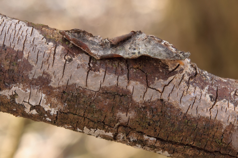 Porostereum spadiceum: Ein in der südlichen Steiermark häufiger Laubholzbewohner mit interessantem Geruch nach nassem Leder oder Mottenkugeln… Hier auf liegendem Fagus-Ast.