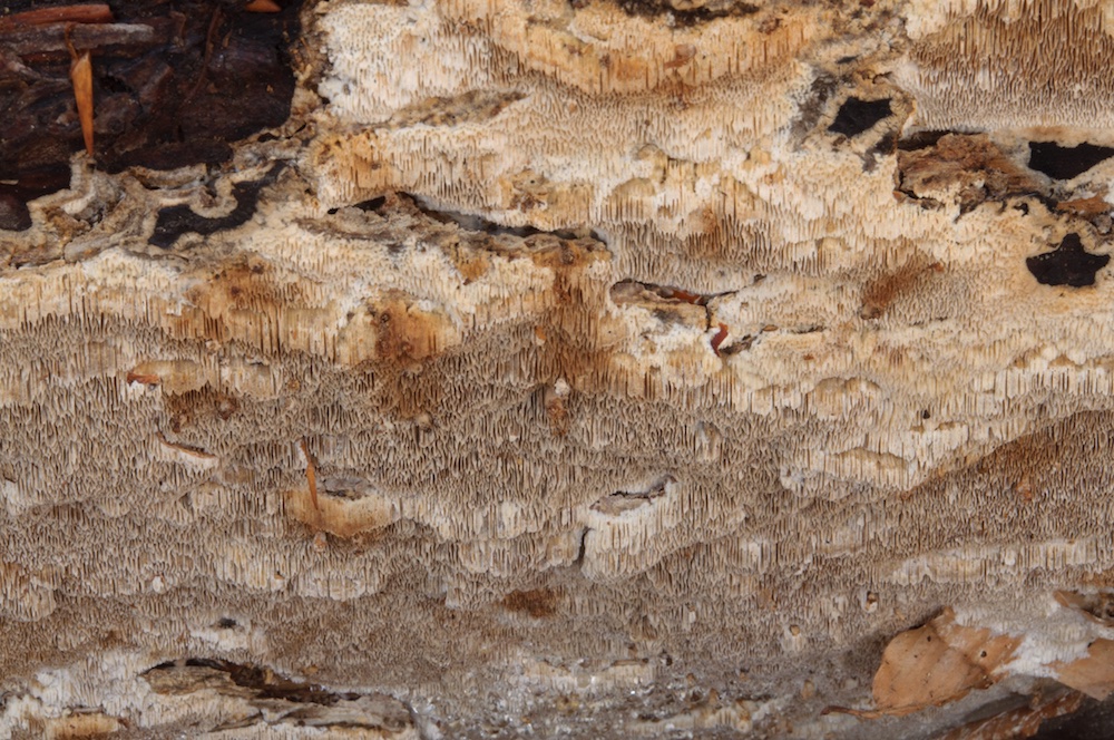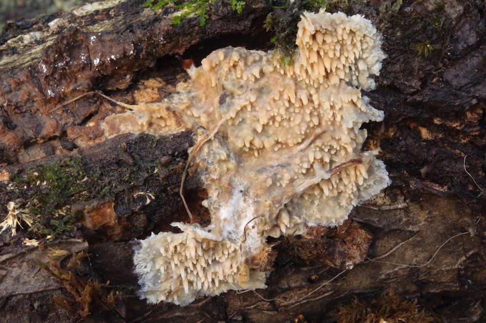 Phlebia queletii: Nun wieder ein besonderer Fund, ohne Eintragungen in der Mykologischen Datenbank. Laut Literatur wächst sie bevorzugt auf Weißtanne, so wie hier (liegender Ast). Die kleinen Stacheln setzen sich aus zugespitzten Lamprozystiden zusammen, sind also im Mikroskop recht hübsch anzuschauen.