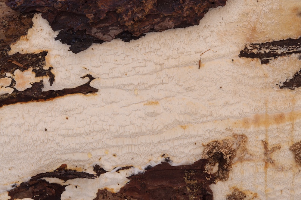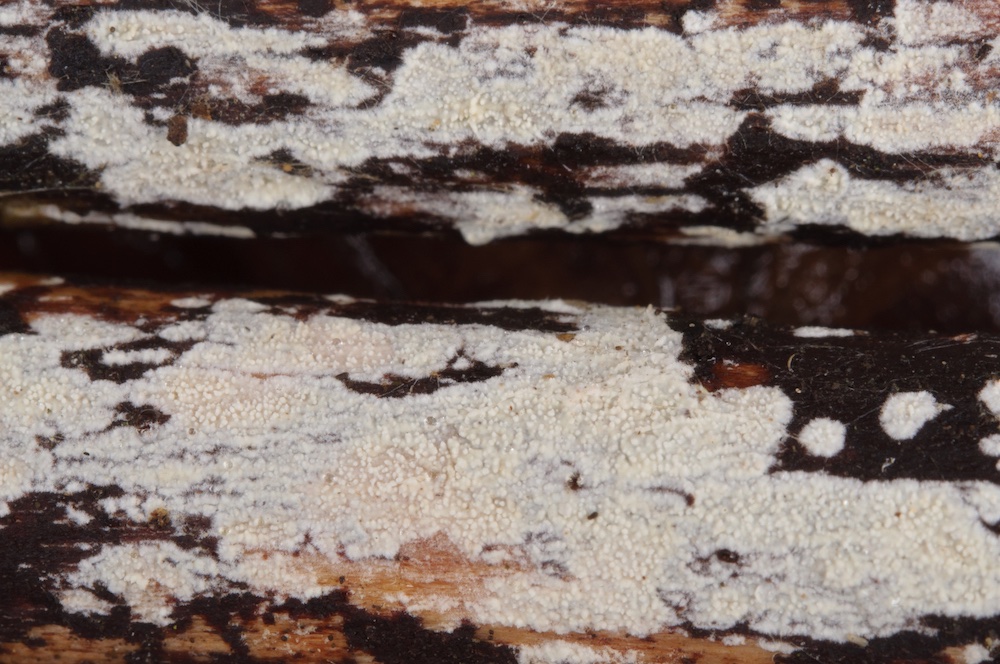 Peniophorella praetermissa agg.: Einer der häufigsten ± flaumigen, weißen Rindenpilze und einen mikroskopisch sehr variablen Artenkomplex darstellend. Entrindeter Nadelholz-Ast.