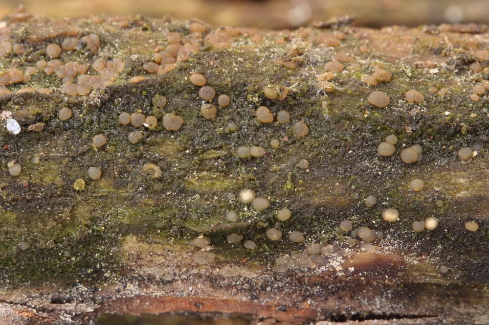 #2Dacrymyces tortus: Klein, unscheinbar und auch kaum gallertig, dennoch eine Gallertträne. Liegender Pinus-Ast.
