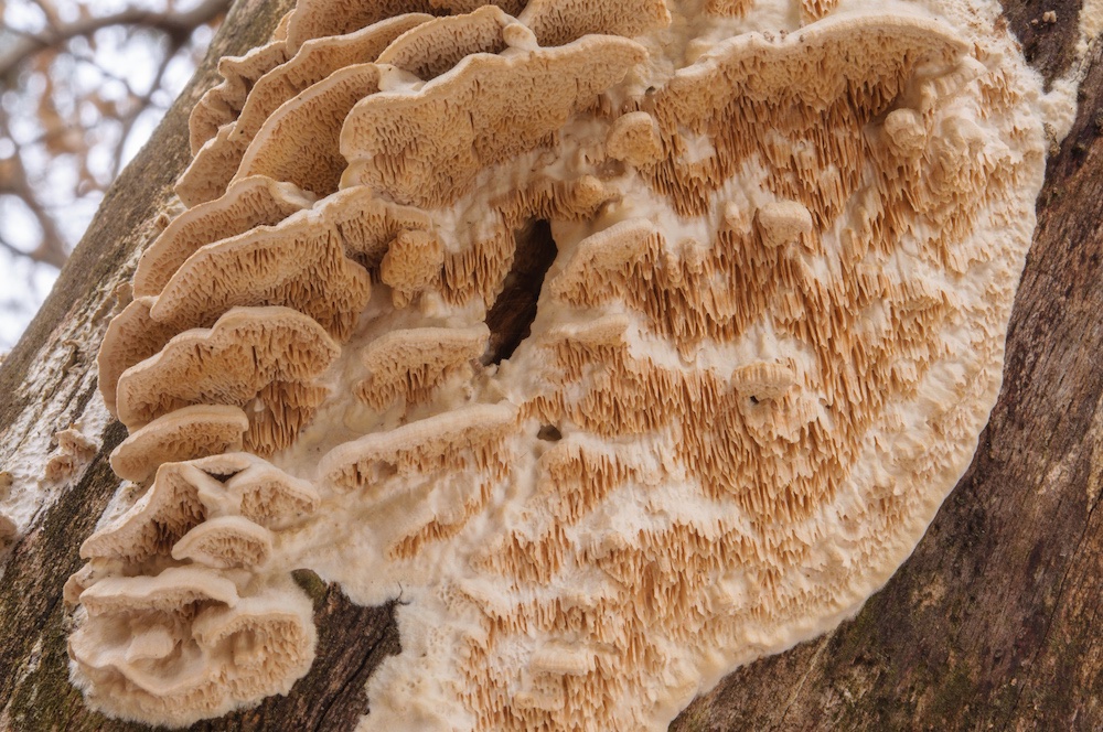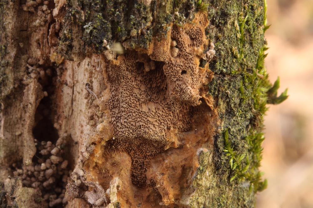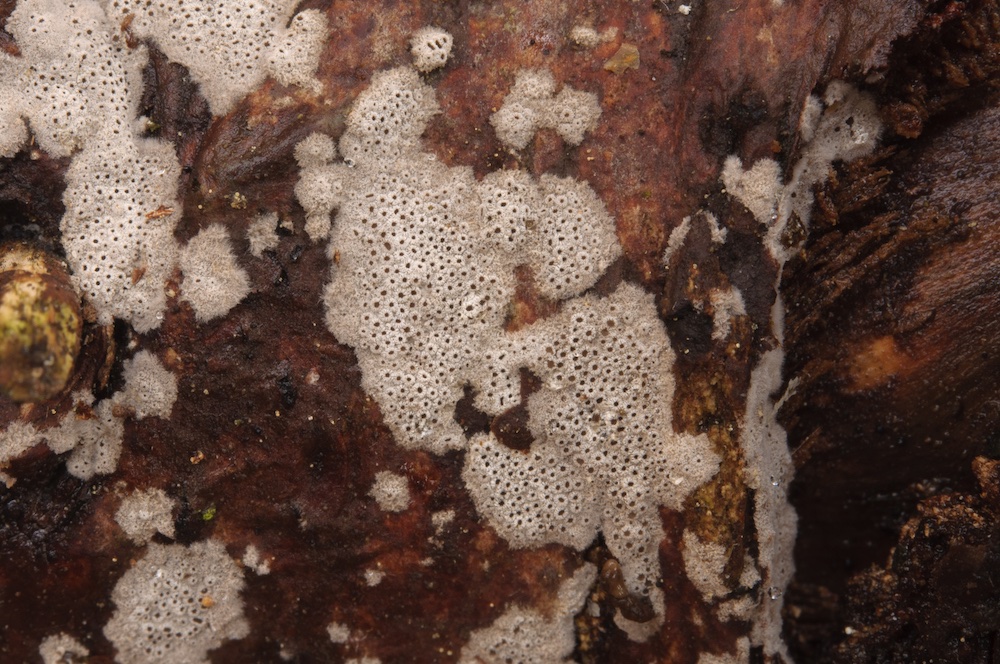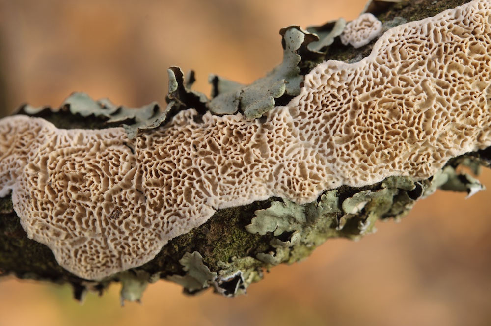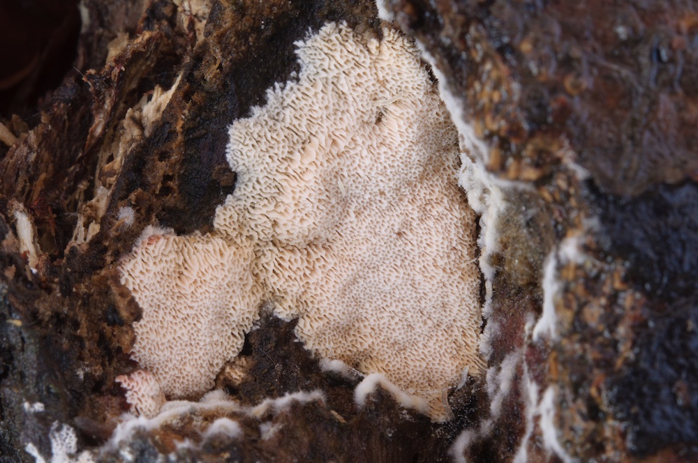 Irpex lacteus: Durch die unregelmäßig labyrinthischen bis zähnchenförmigen Poren und die hellen, resupinaten oder kleine Hütchen bildenden Fruchtkörper schon makroskopisch ganz gut festgelegt. Laubholz-Ast, ca. 1 m über dem Boden. .