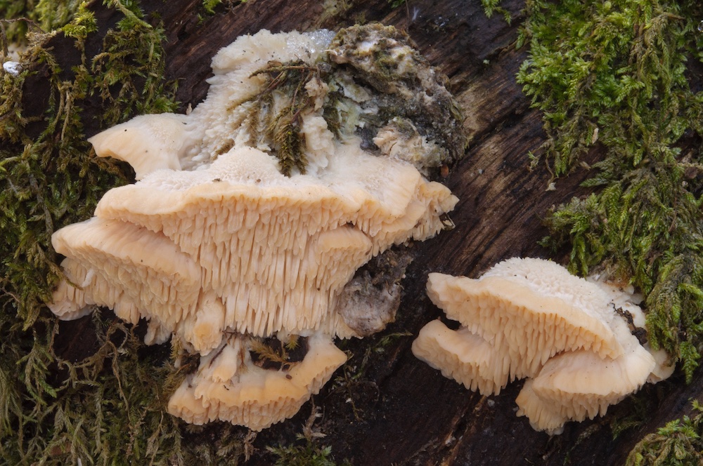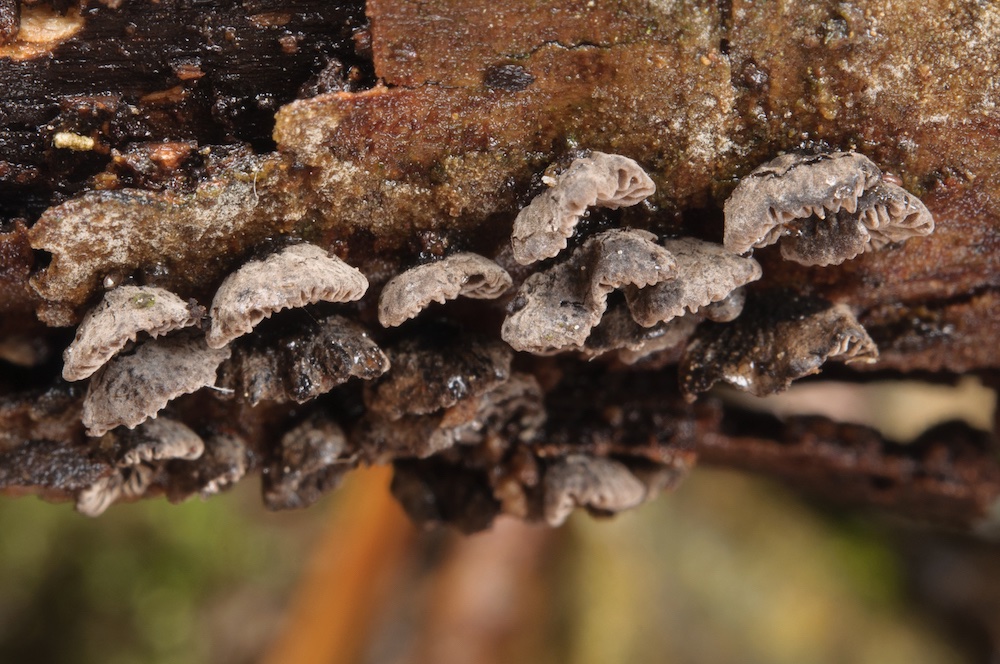 Resupinatus conspersus: Ein typischer Tannenbewohner, der sich schon im Luftraum entwickelt und meist erst dann gefunden werden kann, wenn die Äste zu Boden fallen. .