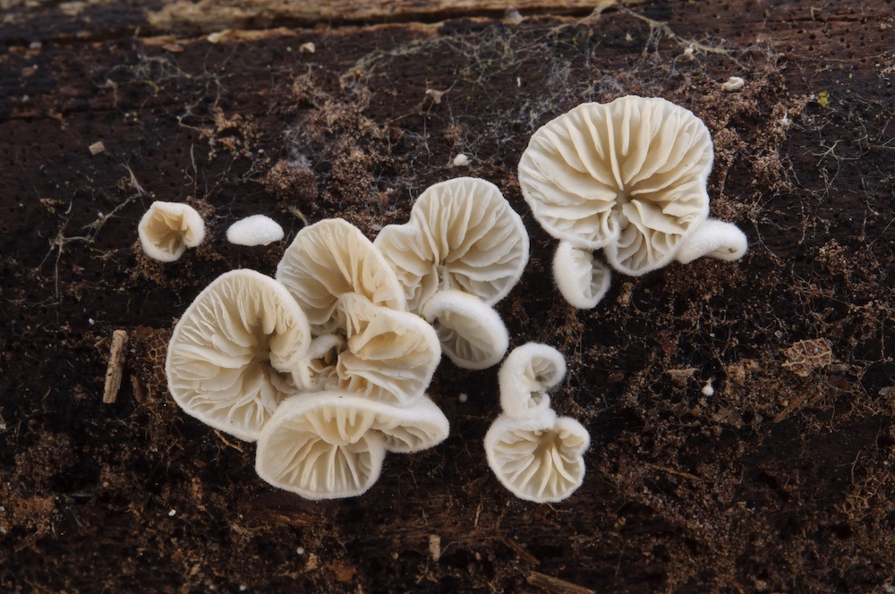 Crepidotus epibryus: Unterseite eines liegenden, entrindeten Laubholz-Stammes. Als weißes Stummelfüßchen nur mikroskopisch sicher bestimmbar, jedoch sind die hellen Lamellen und die späte Erscheinungszeit schon Hinweise für C. epibryus. .