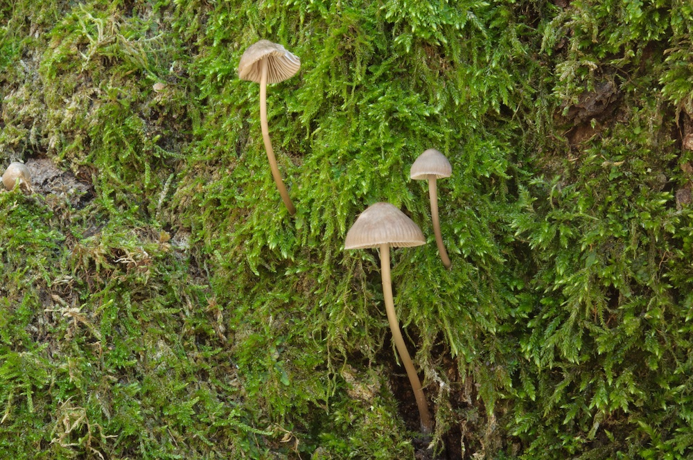 Mycena polygramma var. nana: Die schmächtige Form/Varietät mit kaum gestreiften Stielen an der moosigen Stammbasis einer Eiche. Ob man da wirklich was Eigenes daraus machen sollte, weiß ich nicht, ich bestimme sie aber lieber mal getrennt. .