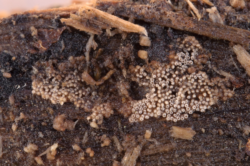 Xylodon crustosus: Hier sind die vielen subulaten (zugespitzten) Hyphenenden in den Zähnchen sowie die zylindrisch-gekrümmten Sporen charakteristisch. Entrindeter Nadelholz-Ast.