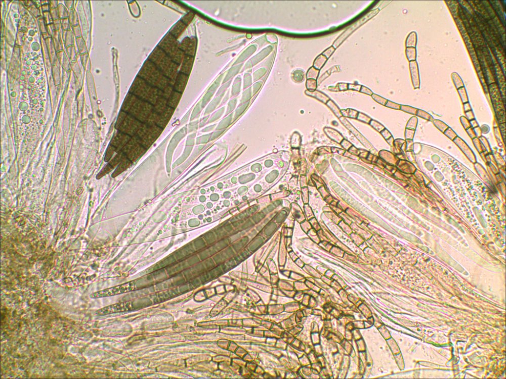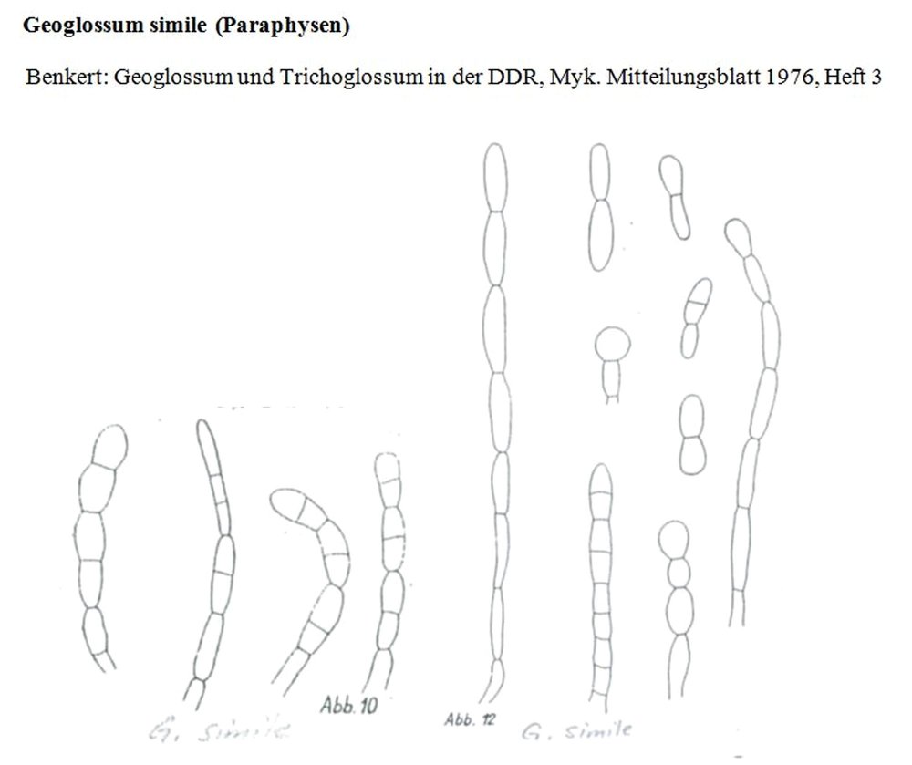 Makroskopisch wäre für mich Geoglossum umbratile schlüssig, die Zystiden passen jedoch gar nicht. Nach den Mikromerkmalen (aus dem Internet) könnte es sich um G. cookeanum handeln. Allerdings finde ich da unterschiedliche Angaben zu den Zystidenformen. Die Sporen sind 7-fach septiert, die Oberfläche scheint mit Noppen besetzt zu sein (bin ich mir aber nicht ganz sicher). Sp-Maße 88,75 - 100 x 7,5 - 10; also relativ große Sp.