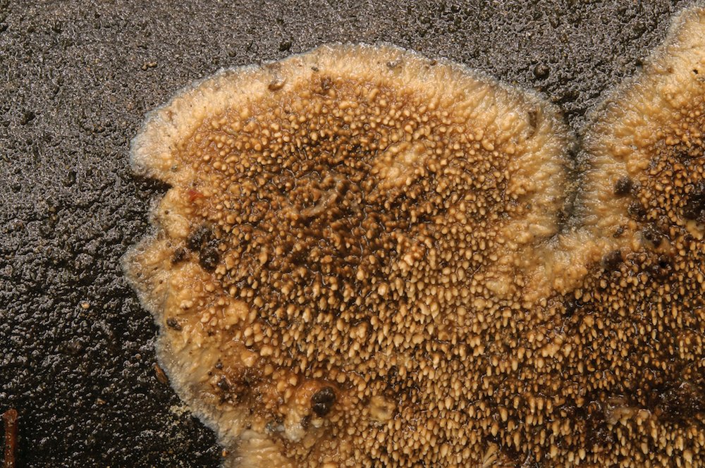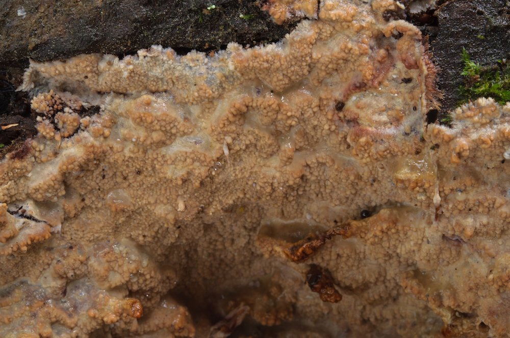 Phlebia mellea: Liegender Fagus-Stamm. Mit ungewöhnlich tuberkulatem Hymenophor.