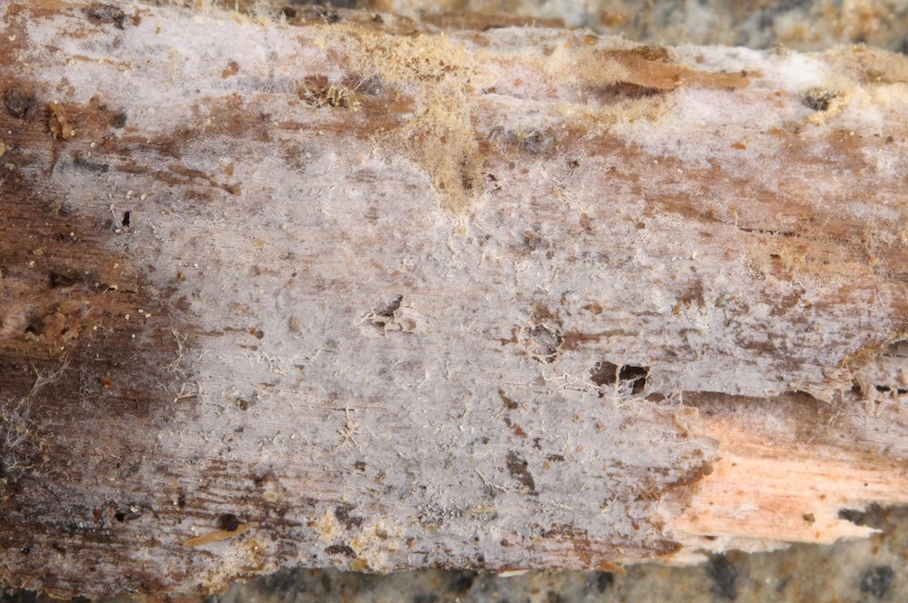 Trechispora confinis: Unterseite eines liegenden Nadelholz-Stücks.