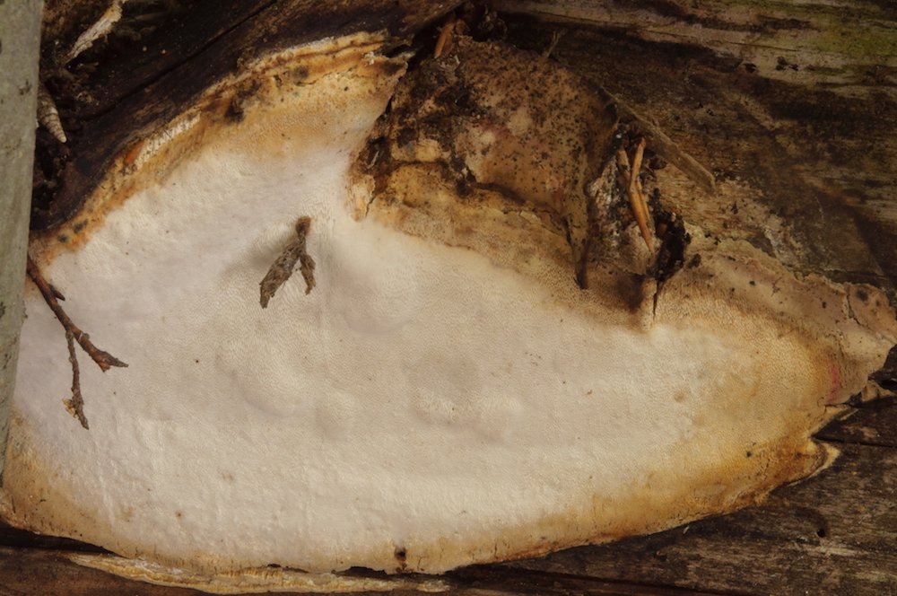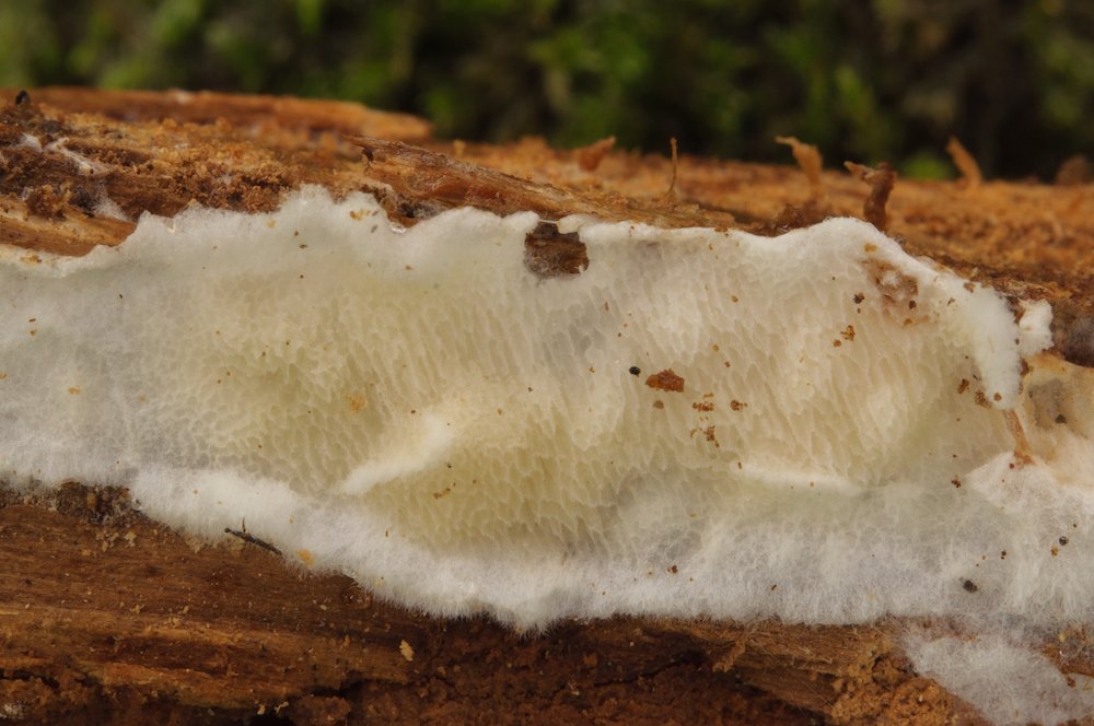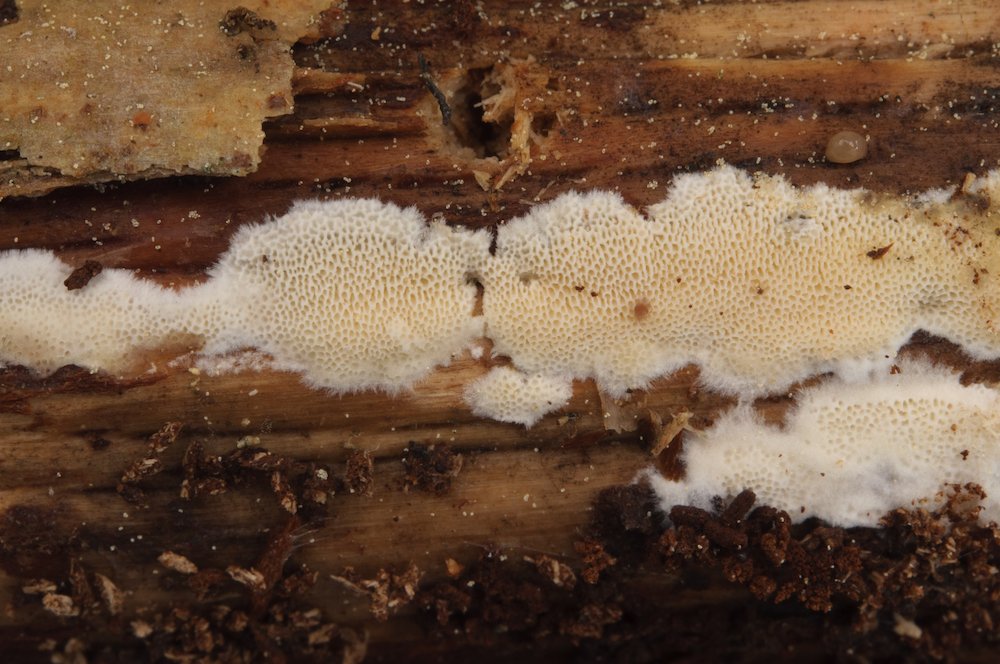 Sarcoporia polyspora: Unterseite eines liegenden Nadelholz-Stücks (wohl Pinus).