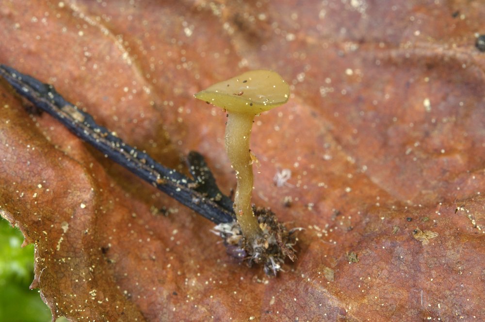 Ciboria "viridula": Eine noch unbeschriebene und hübsch gefärbte Art, hier wohl auf einem alten Blattstiel wachsend.
