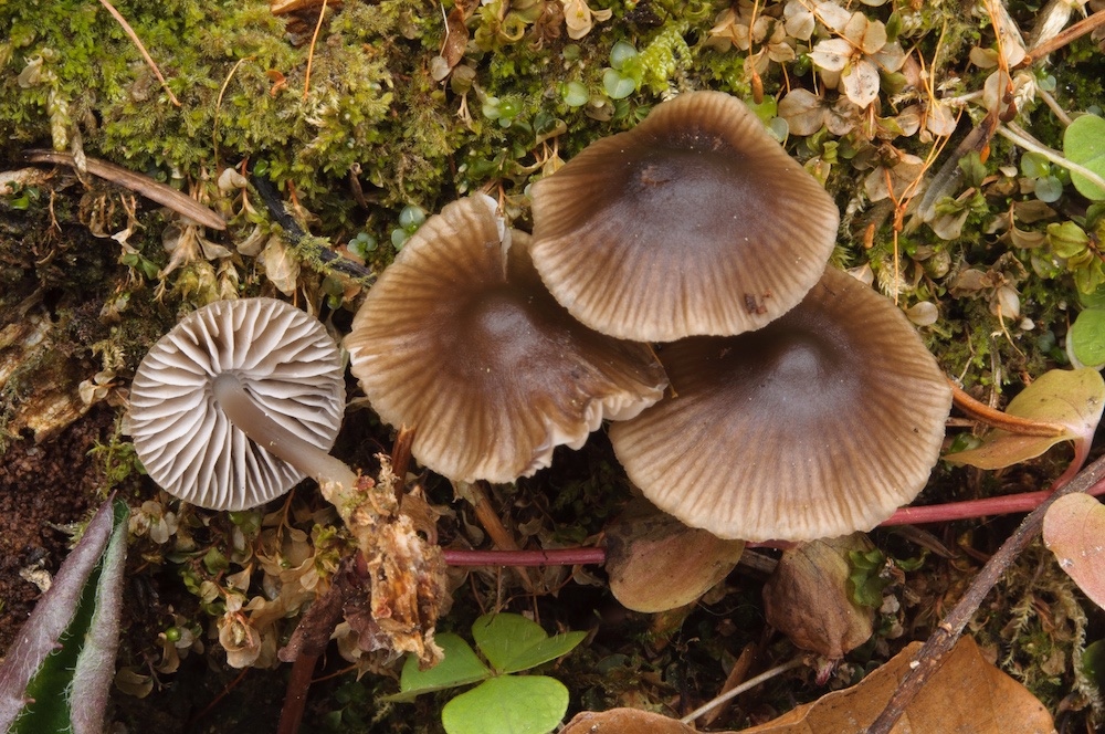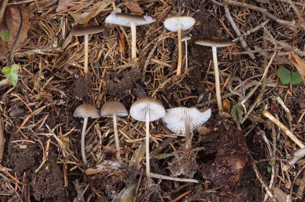 Strobilurus esculentus (oben) und Mycena plumipes (unten).