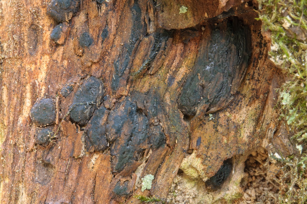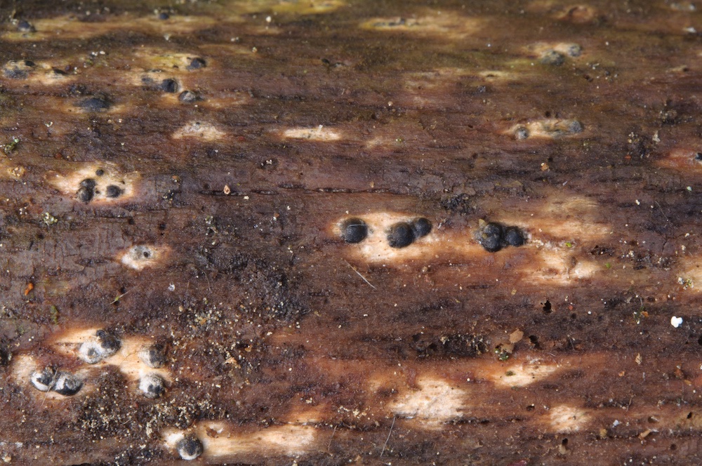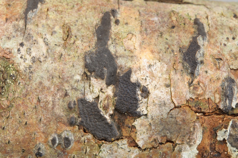 Virgaria nigra und Hymenochaete carpatica: Borke von Acer pseudoplatanus.