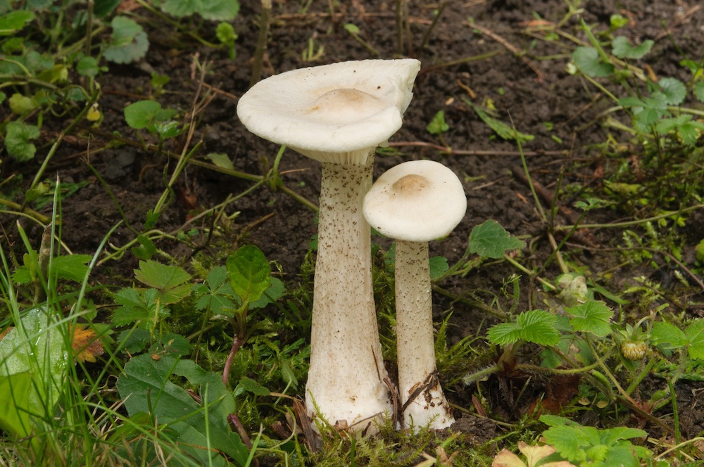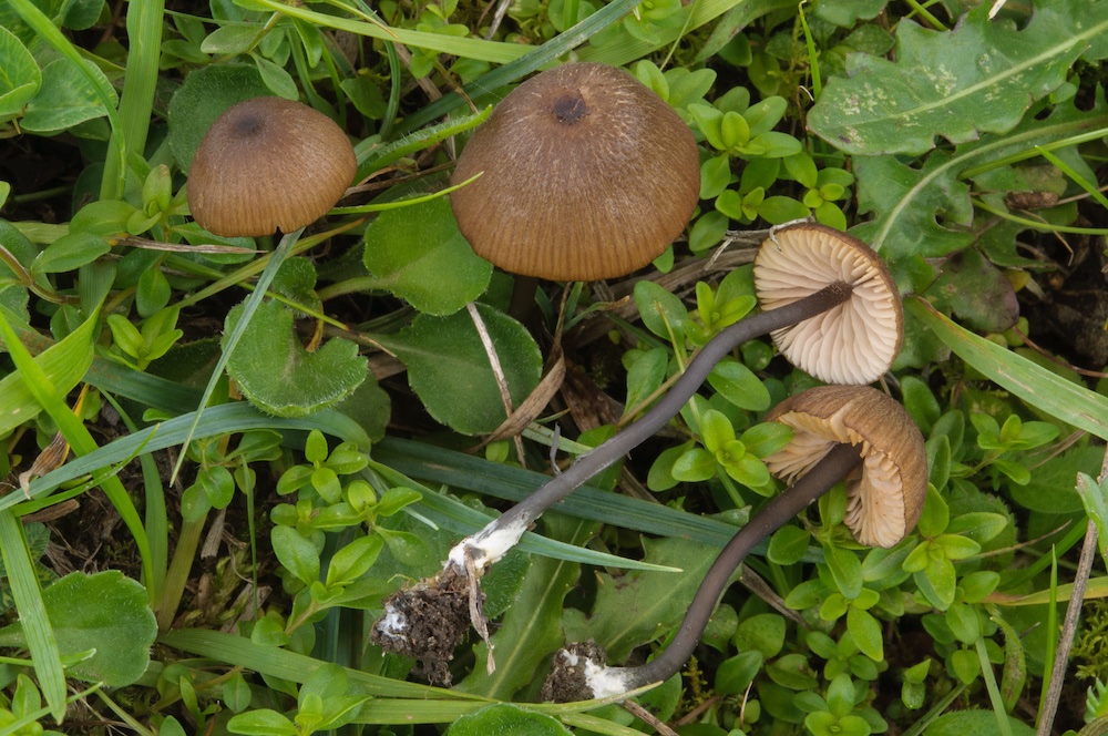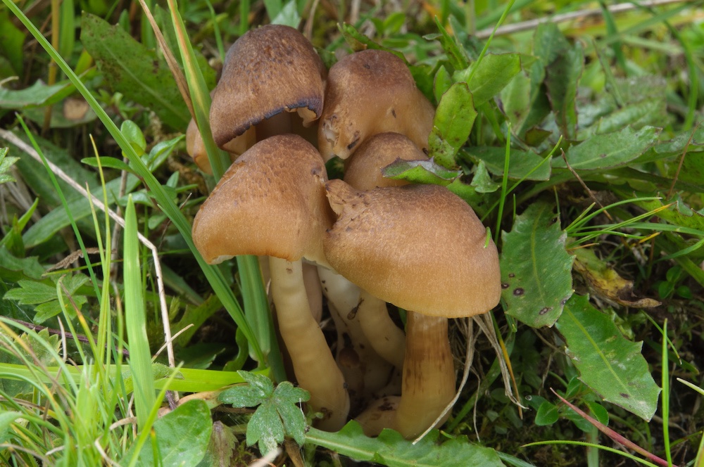Agrocybe cf. pediades: Auf Hackschnitzeln. Mikroskopisch passt m. E. keine andere Art, mich irritieren jedoch die ziemlich stattlichen Fruchtkörper, und der Standort ist auch eher ungewöhnlich.