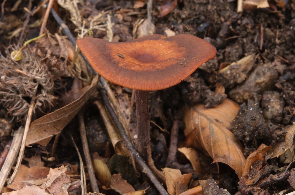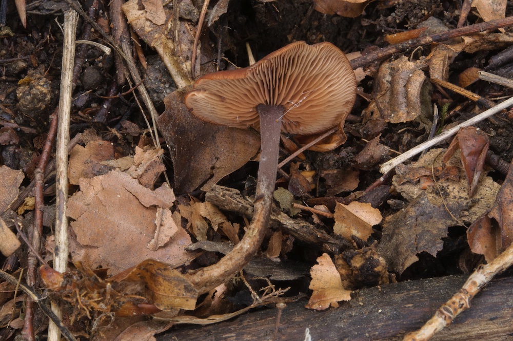 Gymnopus fuscopurpureus: Wohl auch morschem Holz, im schattigen Hangwald bei Ulmus glabra, Fraxinus, Fagus.