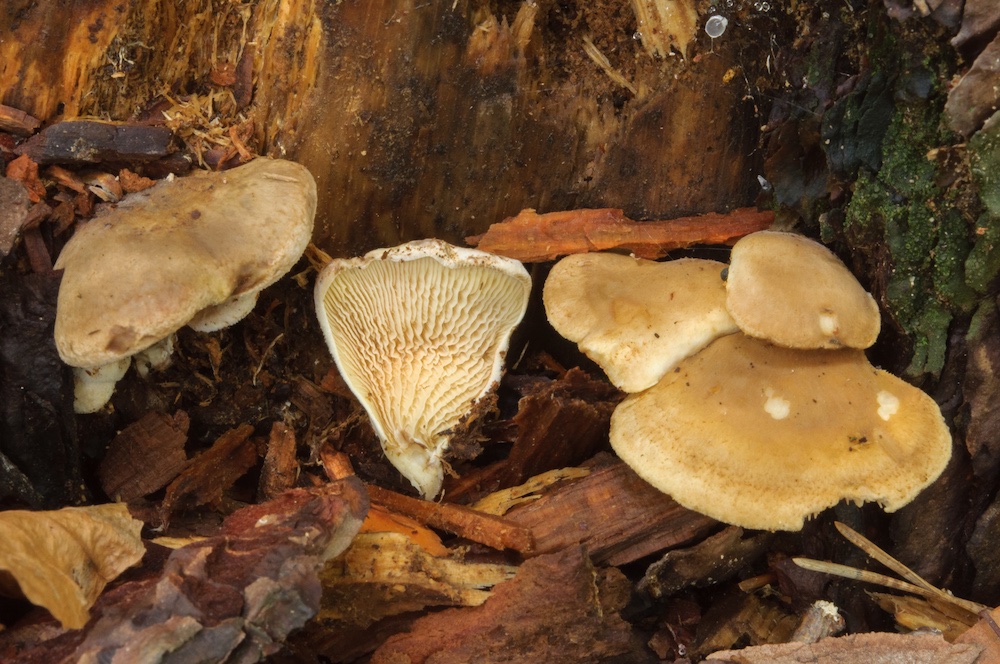 Tapinella panuoides: Basis eines abgestorbenen Pinus-Stammes.