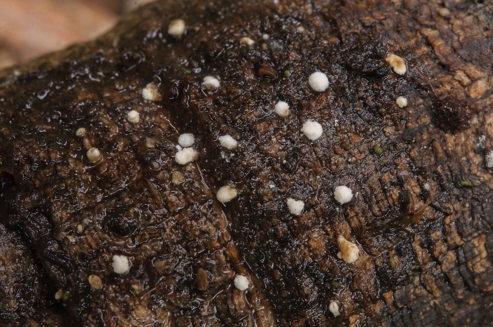 Onygena equina: Auf Horn eines Gams-Schädels. Nur die Nebenfruchtform mit Chlamydosporen vorhanden. .