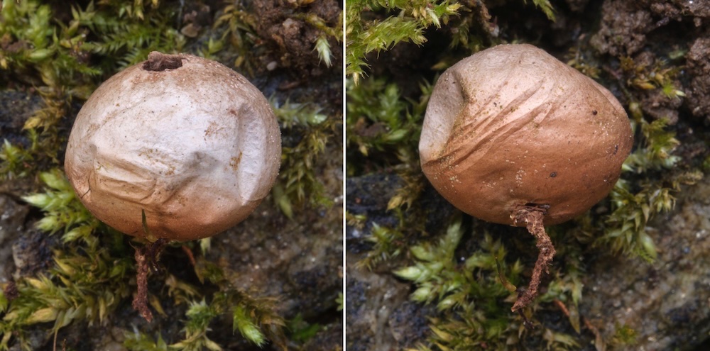 Tulostoma brumale: Kalktrockenrasen. Die zweite Kollektion war ungewöhnlich kräftig und mit einem schuppig aufbrechenden Stiel eher untypisch.