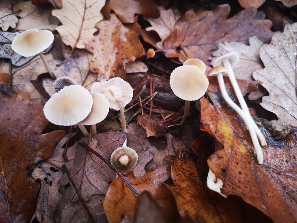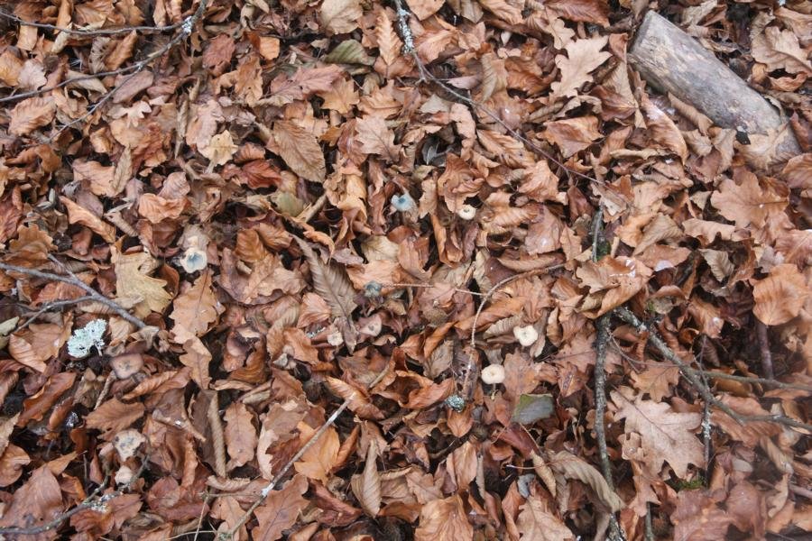 Junge Fruchtkörper nützen das Laub als Tarnhaube, da ist die Nase in Zeckenreichweite,