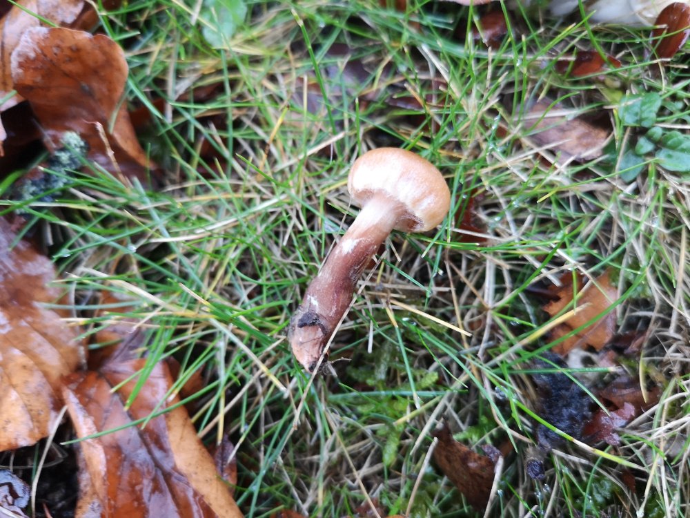 1. Hut graubräunlich, 5cm Durchmesser, Lamellen jung blau, im oberen Stielschnitt bläulich. Stiel zylindrisch bis zurBasis gleichbleibend, Hut schleimig bei Feuchtigkeit. Unter Buchen. Geruch sehr einprägsam nach Steinpilz aber stärker.