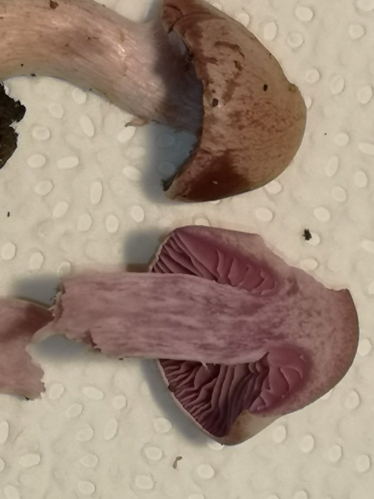 3. Heu weißgrau, 4 cm Durchmesser, Lamellen jung blauviolett, Stielschnitt blauviolett, Stiel an der Basis fast weiß gegen die Spitze immer bläulicher, einfach gegürtelt, zyindrisch, an der Basis leicht verbreitert. Bei Kiefern.
