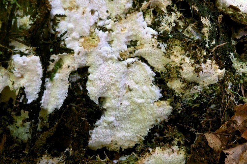 Wieder an einem alten Nadelholzstrunk wuchs ein resupinater, weißlicher Porling mit fransigem Rand (z. T. sind auch Myzelstränge vorhanden). Im Mikroskop muss man genau schauen, um die im Durchmesser weniger als 4 µm messenden Sporen zu entdecken. Die Rede ist von Porpomyces mucidus.