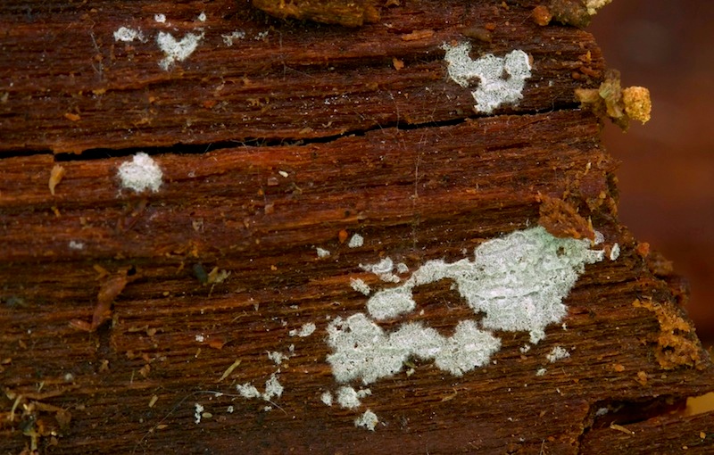 Und schließlich die wohl unscheinbarste dieser Arten, Lobulicium occultum. Sie wächst nur (soweit ich weiß bzw. das bisher selber beobachten konnte) auf der Unterseite braunfauler, stark vermorschter Nadelholzstücke, besonders in alten, liegenden Stämmen. Obwohl ich mehrere Standorte im Kärntner Koralmgebiet nahe der Grenze zur Steiermark kenne (ein Foto habe ich hier bereits gezeigt), ist dies der erste mir bekannte in der Steiermark.