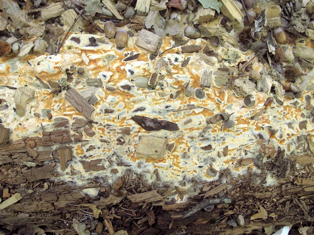 Gefunden am Rande einer Finnenbahn auf Holzschnitzeln und Eicheln. Etwas anderes als Meruliaceae fällt mir nicht ein.