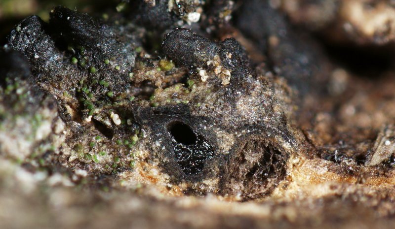 Die erste Art fällt bereits unter der Lupe durch ihre schlitzförmigen, erhabenen Ostiolen auf. Die Ascomata sind ansonsten eingesenkt bzw. kommen manchmal auch etwas an die Oberfläche. Form und Größe sind sehr variabel. Man findet sie ziemlich häufig auf der Borke älterer Laubbäume, besonders im Bereich der Stammbasis, aber auch viel höher am Stamm.
