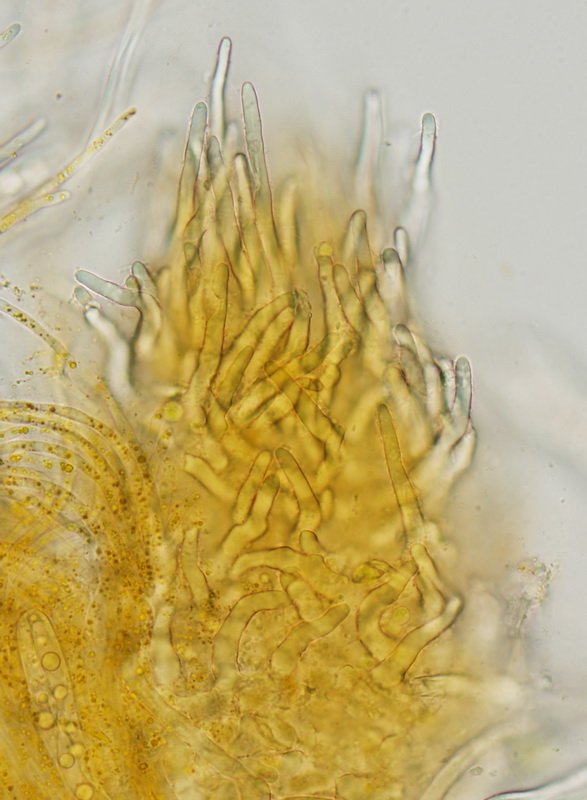 Noch kleiner aber dafür auffälliger gefärbt ist dieser Moosparasit auf Frullania. Besonders interessant finde ich, dass er zur Familie der Pyronemataceae gehört, also ein naher Verwandter zahlreicher bekannter Becherlinge – wie z. B. Scutellinia, Aleuria etc. – ist. Durch die Sporen mit Anhängsel kann man die Art leicht erkennen.