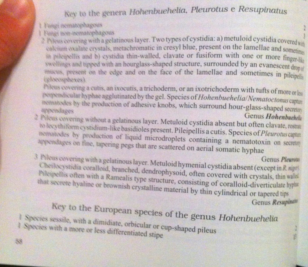 Der Habitus passt genau auf H. cyphelliformis. Besonders auffällig finde ich den starken Kontrast zwischen der dunklen Hutoberseite und den weißen Lamellen. Diese sind auch dünner als man es sonst von Hohenbuehelia gewöhnt ist. Die Sporengrößen sind in der Literatur ganz unterschiedlich angegeben. Die Cystiden sind sehr variabel und relativ dünnwandig. Die ist selten. Frisch hab ich sie erst einmal gesehen. https://www.zobodat.at/pdf/Sydowia-Beih ... 7-0141.pdf aus dem Kleinen Kösselbachtal.