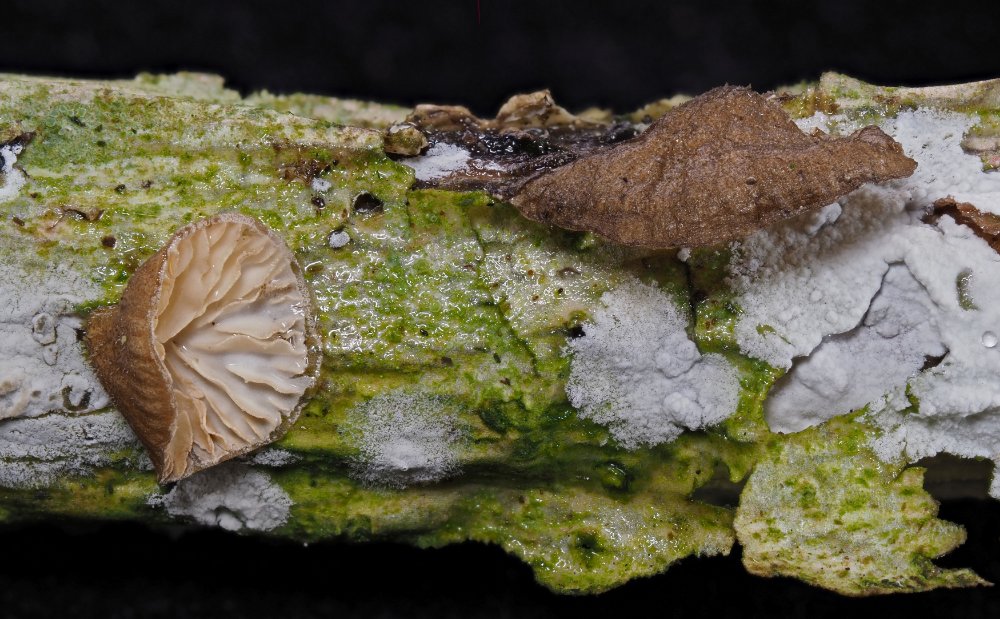 Spotanfund aus meinem Garten an einem Strauch-Eibisch am 6. Jänner, wobei mir nur der weiße Überzug (Lyomyces sambuci) aufgefallen ist. Unter der Stereo haben sich dann ein angetrockneter Frkp eines kleinen Seitlings (H max. 5mm) gezeigt - nach "Wiederbelebung" in feuchter Kammer ist das Foto entstanden.