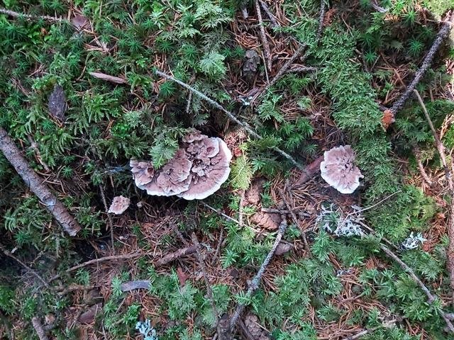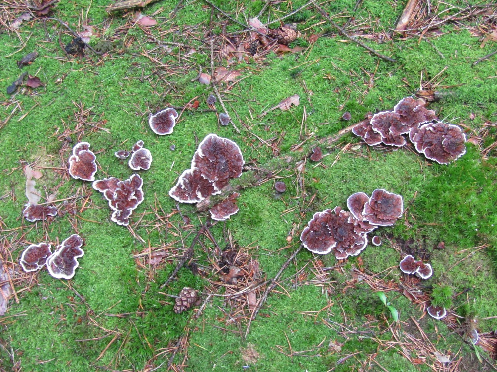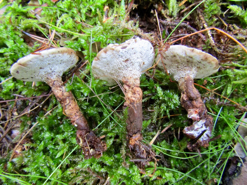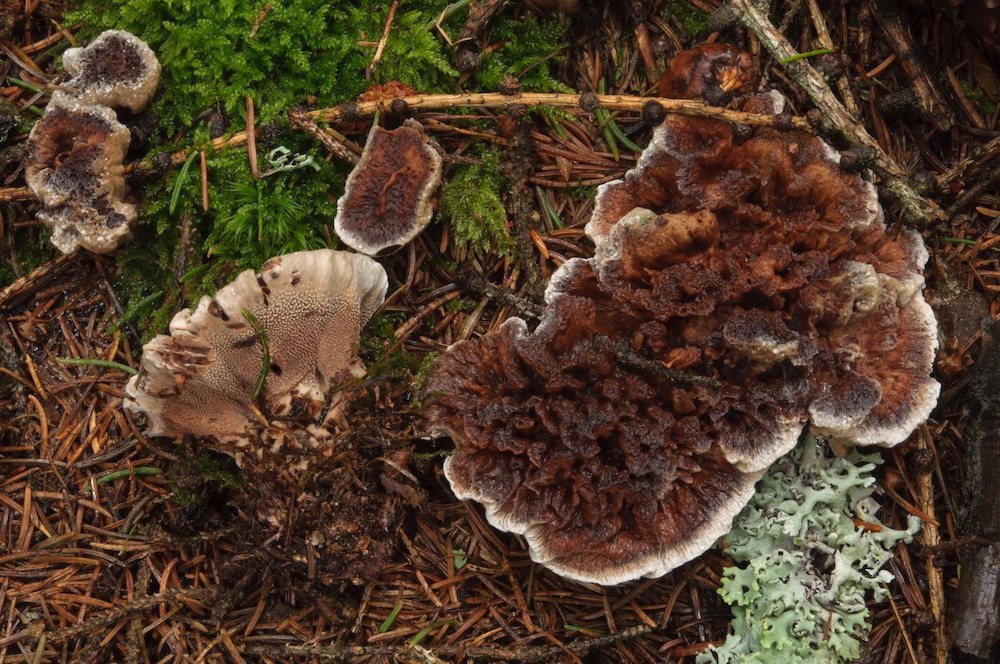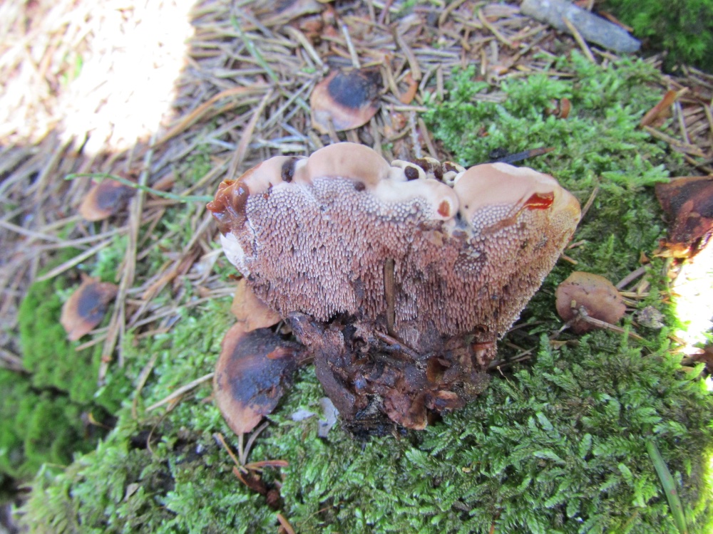 An einer Stelle habe ich heute drei Arten gesehen, die durcheinandergewachsen sind. Es lässt sich dann kaum mehr sagen, welchen Kollektionen die einzelnen Pilze zuzuordnen sind, vor allem wenn sie unterschiedlich alt sind. Dies betrifft vor allem die Abgrenzung der verschiedenen Hydnellum-Arten. Wer weiß was sich da bzgl. der Artabgrenzung in Zukunft noch alles tun wird.......