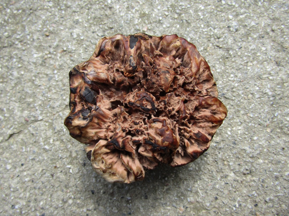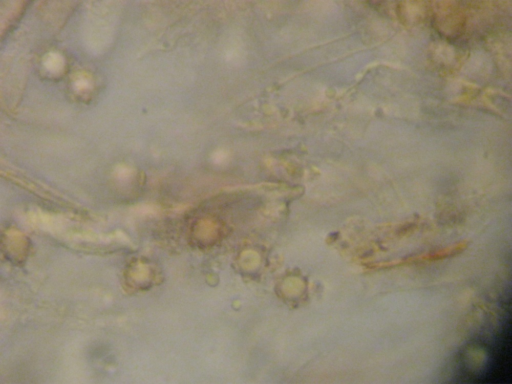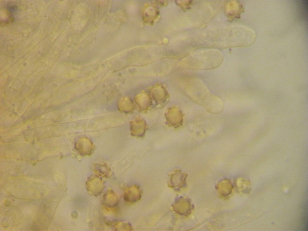 Ziemlich rätselhaft sind mir weiterhin diese dickfleischigen Korkstachlinge. Nach der Sporenform und dem standortidenten Vorkommen würde ich ebenfalls sagen, es ist Hydnellum scrobiculatum, allerdings fehlen die radialen Strukturen, dafür gibt es viele Buckel. Die Fleischdicke beträgt ca. 15 mm. Nach Geesteranus wäre nur H. ferrugineum so dick, an den Pilzen waren aber in allen Altersstadien niemals Bluttropfen zu sehen. Ich denke da käme man nur mehr mit DNA-Sequenzierungen weiter.