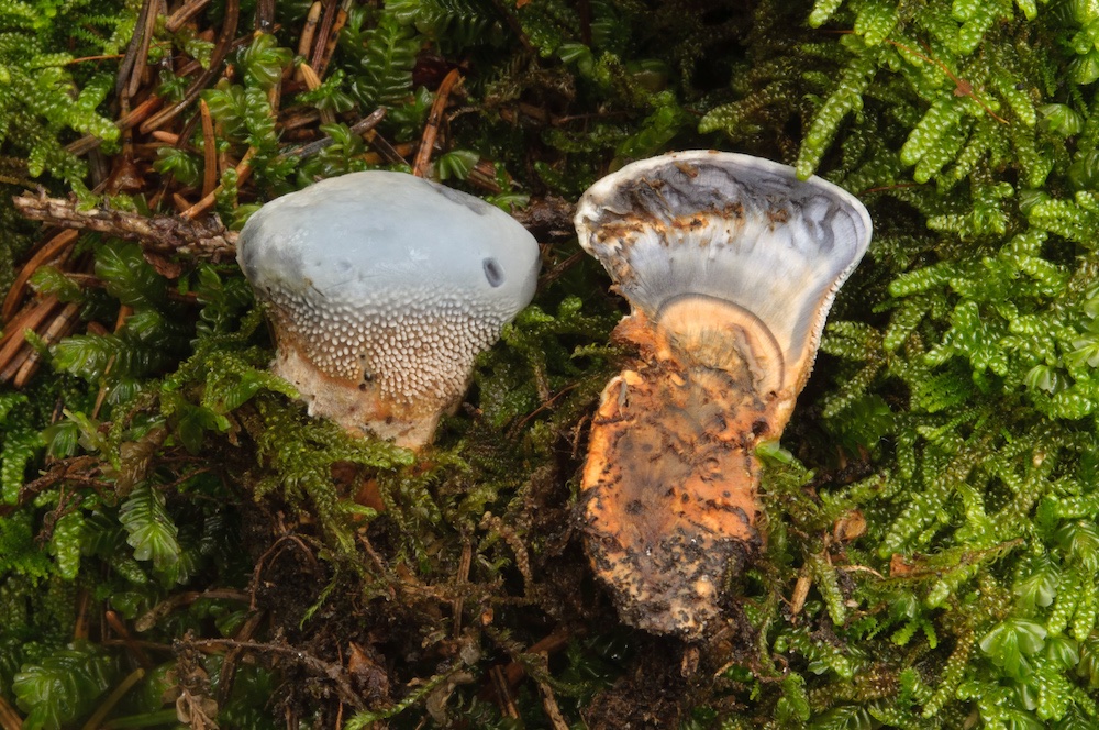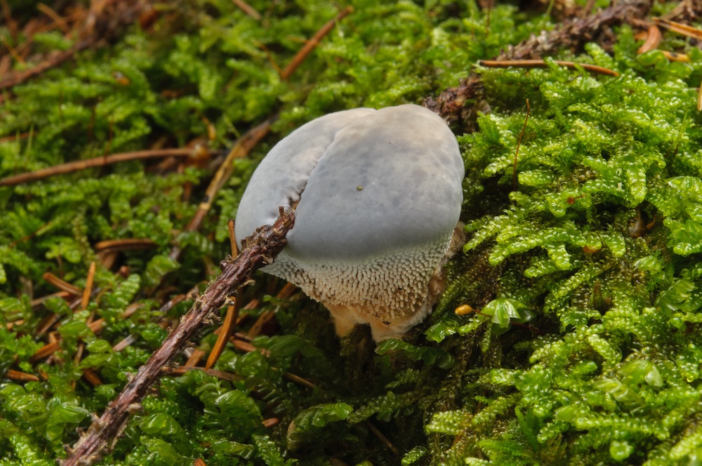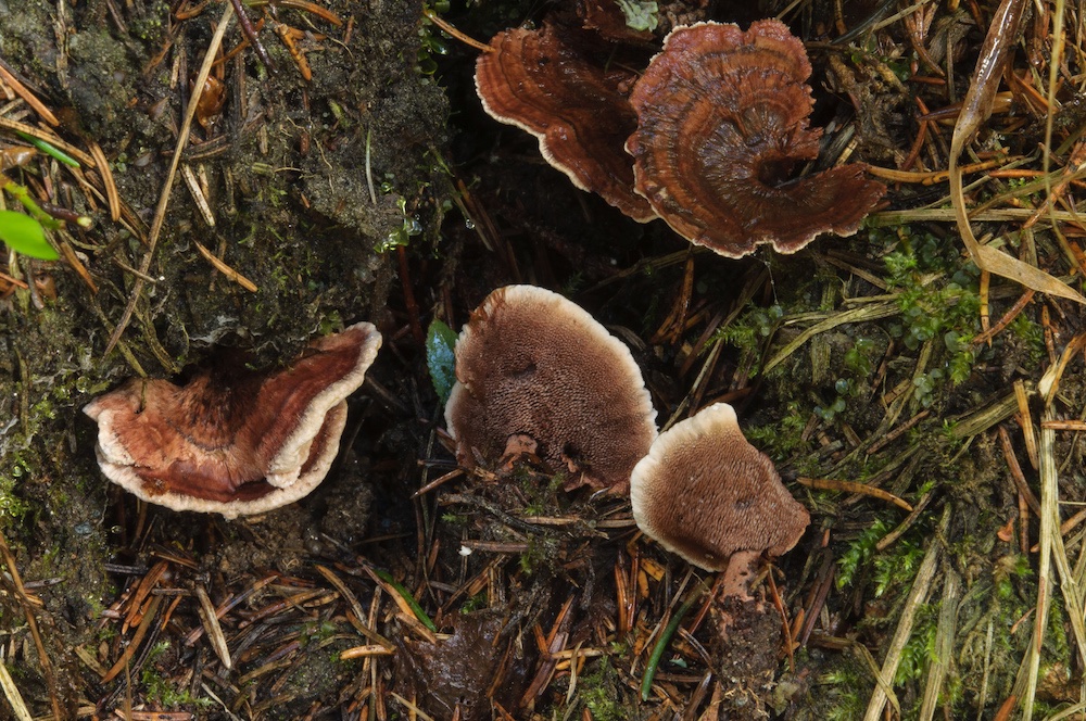 Auriscalpium vulgare, von Phellodon tomentosus umwachsen