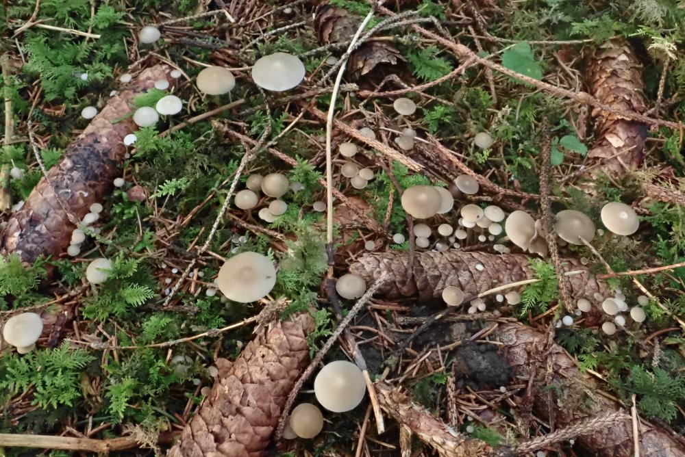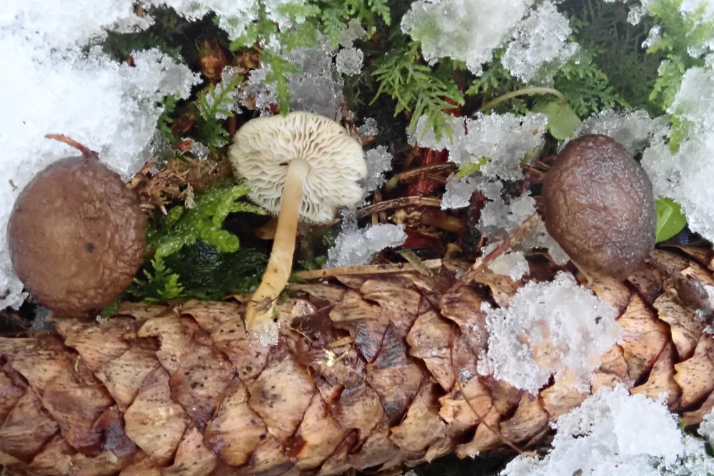 Strobilurus esculentus hat es ab Ende Februar buchstäblich zum mähen gegeben. Man konnte stellenweise gar nicht mehr gehen, ohne welche zu zertreten. Zwischendurch haben sie aus dem Schnee heraus geschaut. Dazwischen, jedoch weitaus weniger waren auch Mycena plumipes zu entdecken.