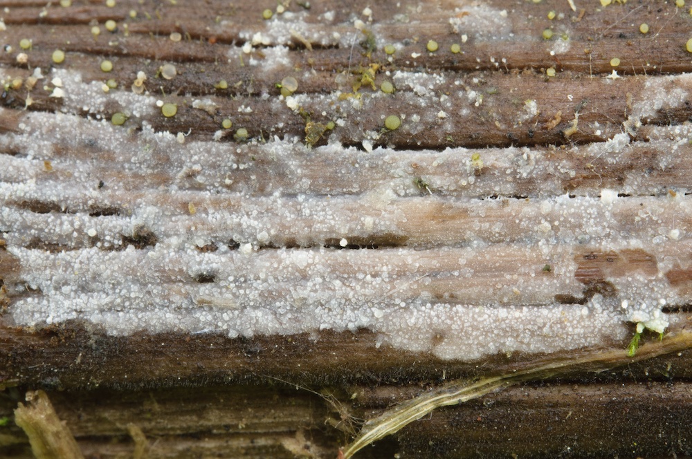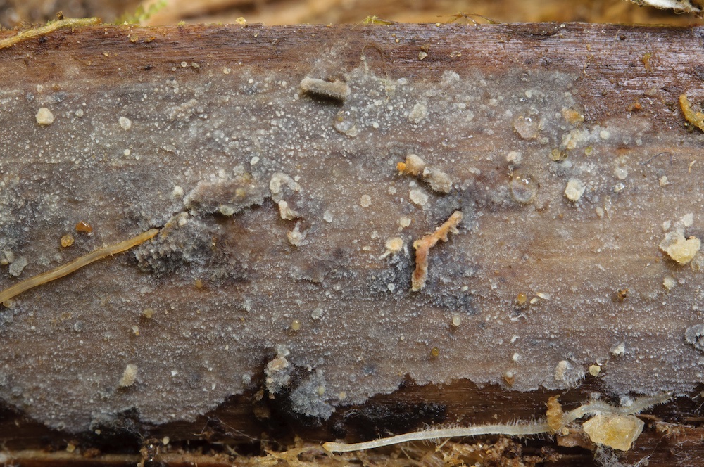 Botryobasidium conspersum: Nebenfruchtform. Liegender Quercus-Ast.