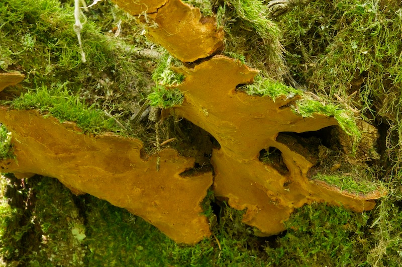 Abschließend noch ein Hängeröhrchen (Henningsomyces candidus) auf der Unterseite eines morschen Picea-Holzstückes in einem liegenden Stamm: