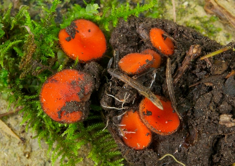 Scutellinia trechispora auf feuchter Erde unweit der Pachyella: