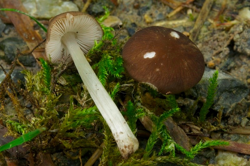 Ein kleiner, braunhütiger Dachpilz mit fein runzeligem Hut, gefunden auf dick bemoostem Corylus-Holz: Pluteus nanus.