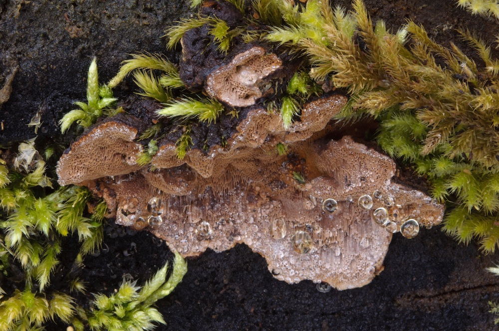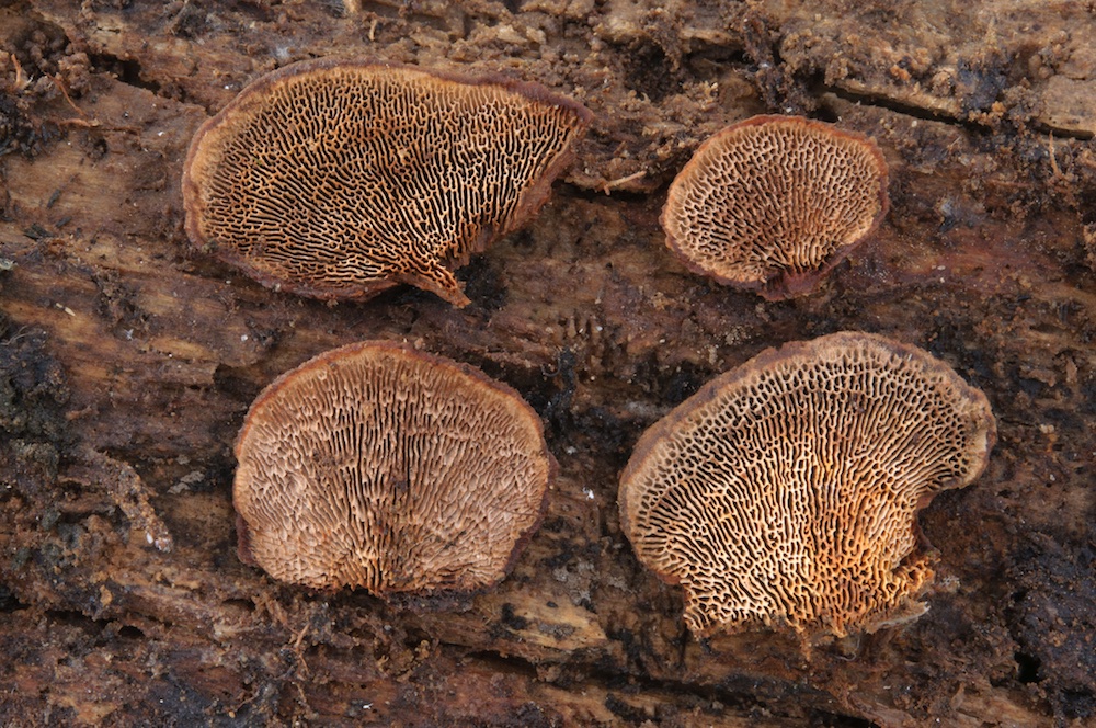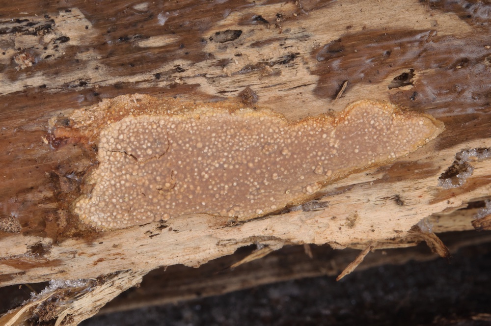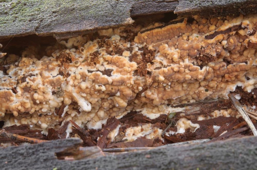 Protomerulius brachysporus: Larix-Ast. Bestimmt mit Spirin et al. (2019) und demnach u. a. durch das Substrat (Nadelholz) und dicke Fruchtkörper gut festgelegt. Erinnerte makroskopisch etwas an Phlebiopsis gigantea.