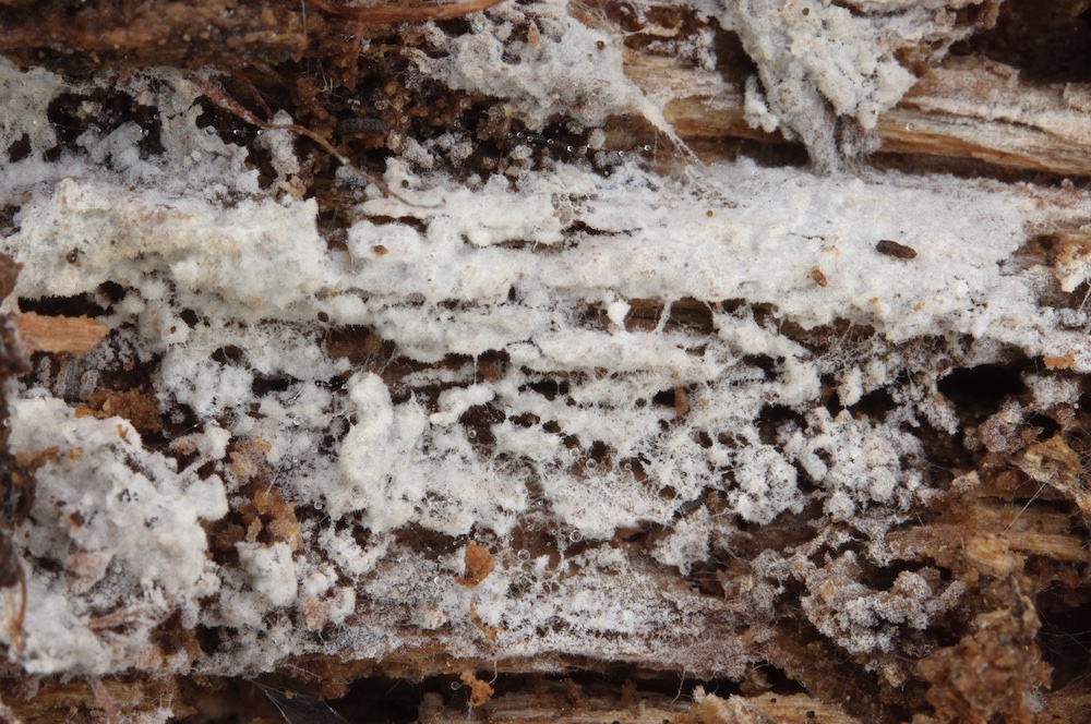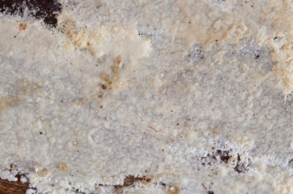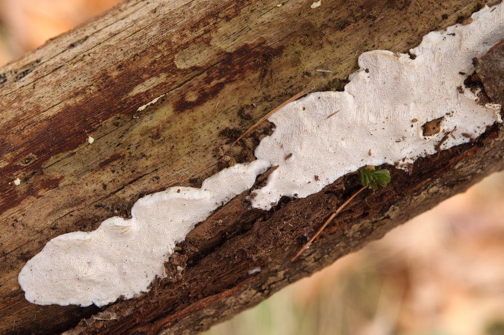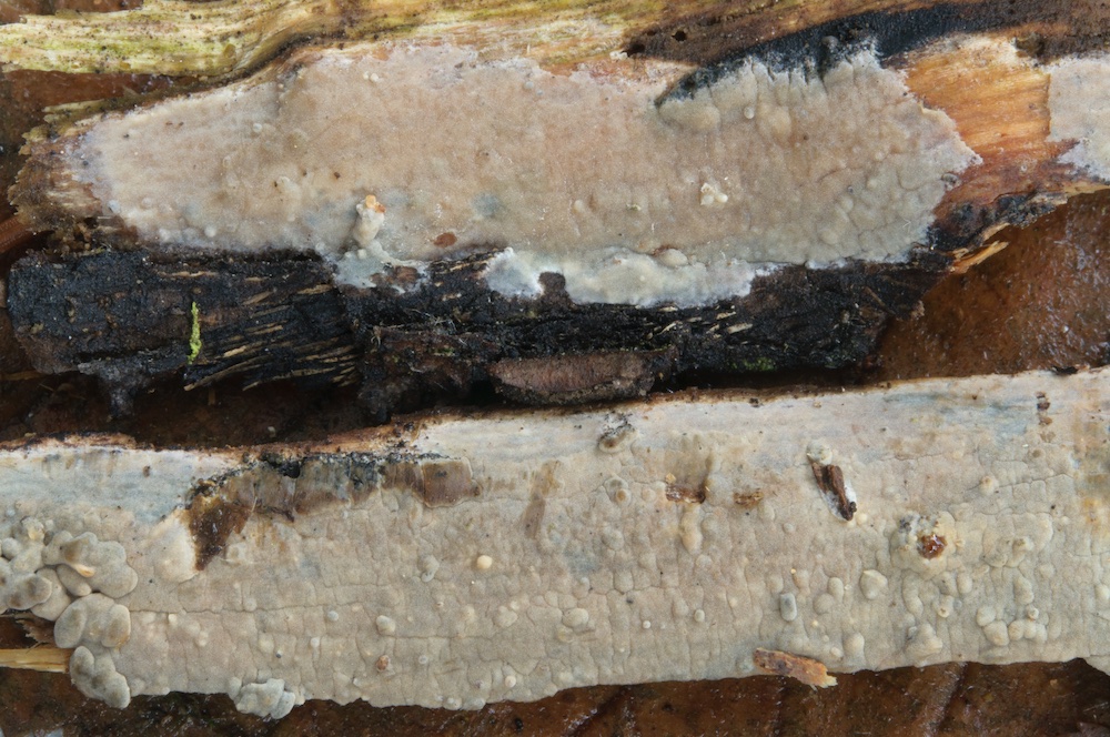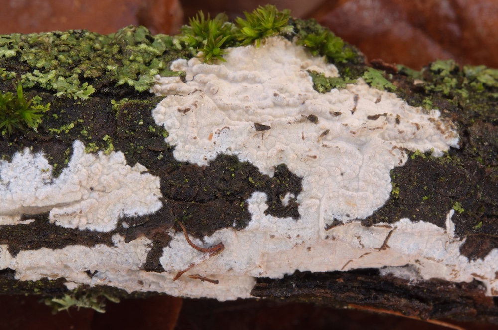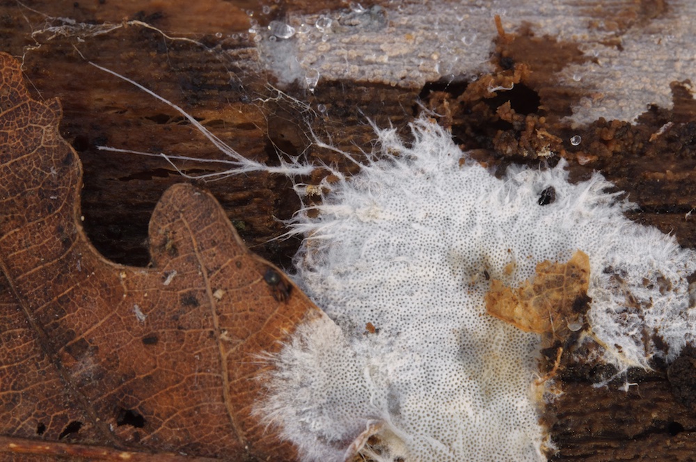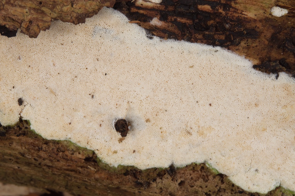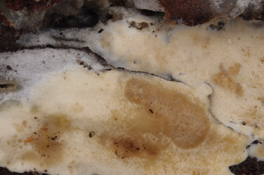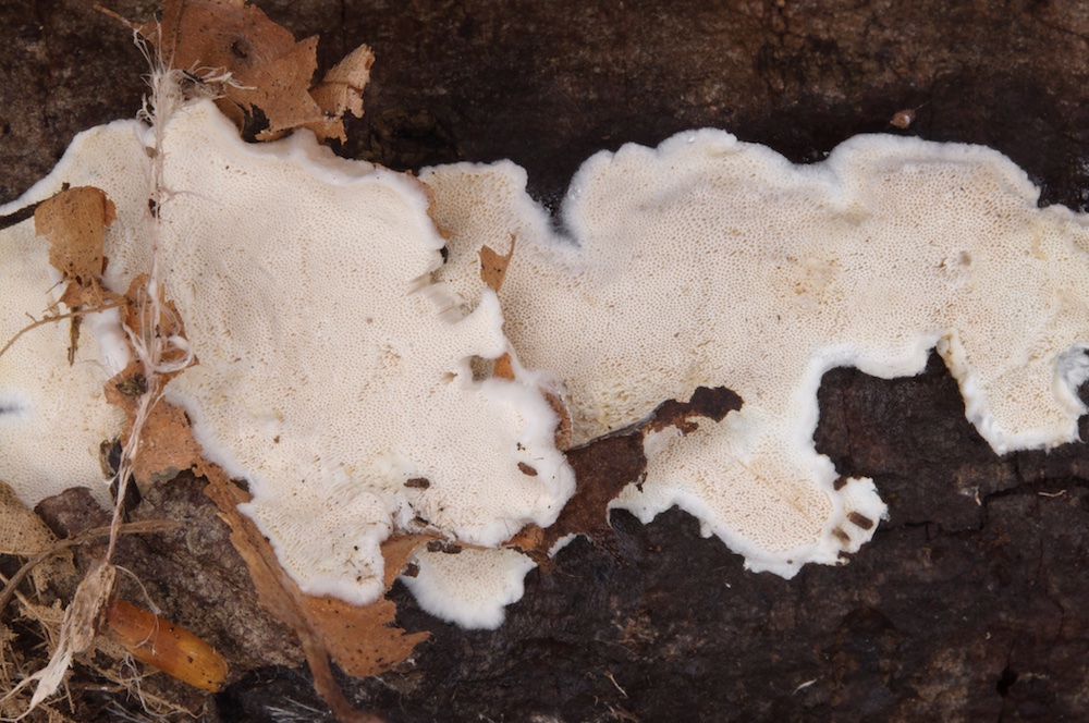 Fibrodontia gossypina: Laubholz-Stamm, Unterseite. Mit auffälligen Skeletthyphen.